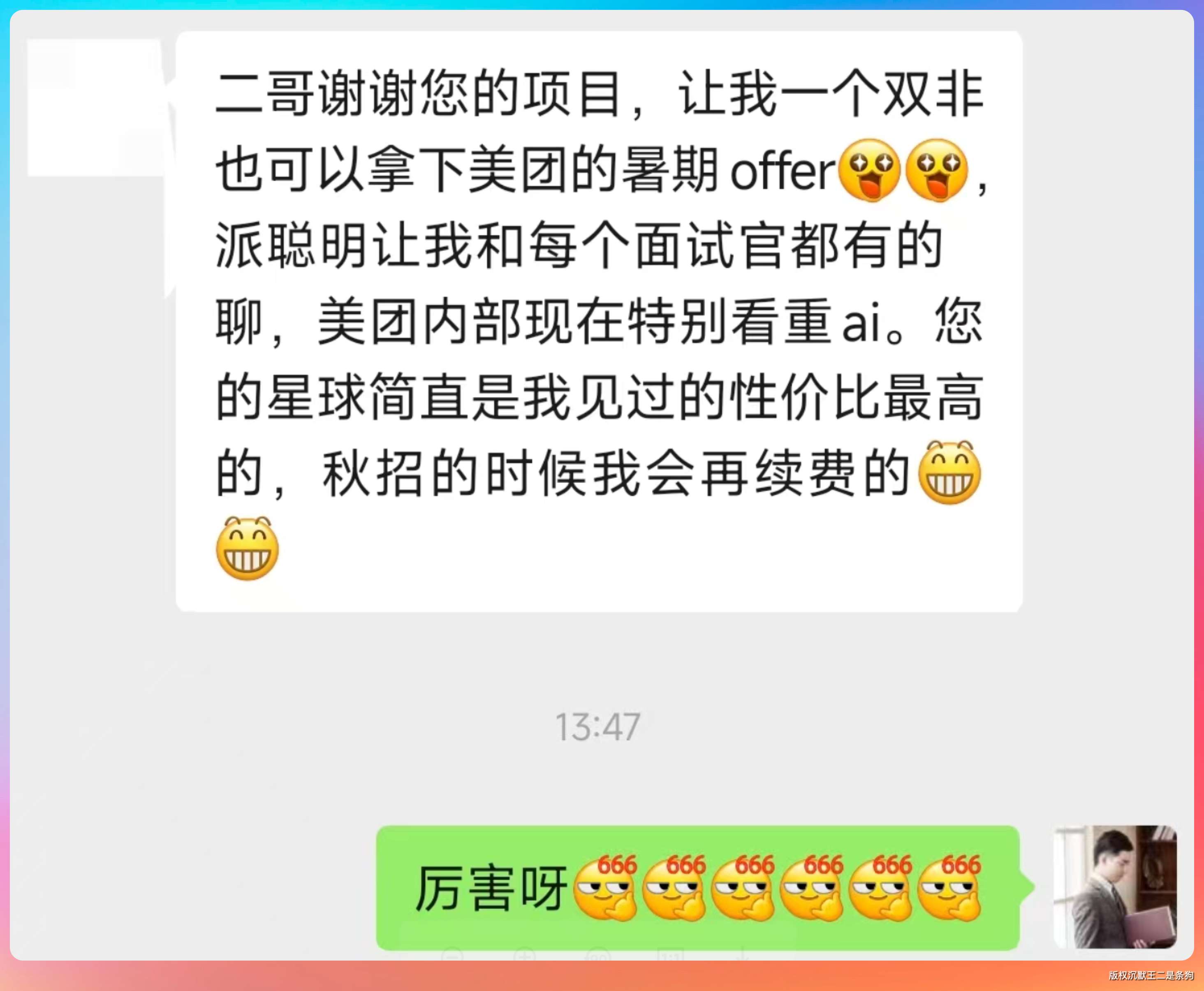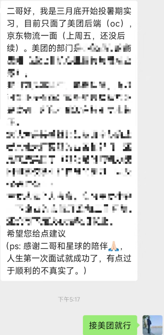 3、双非拿下美团暑期实习 offer。派聪明让我和每个面试官都有的聊,您的星球简直是我见过的性价比最高的,秋招的时候我会再续费的。