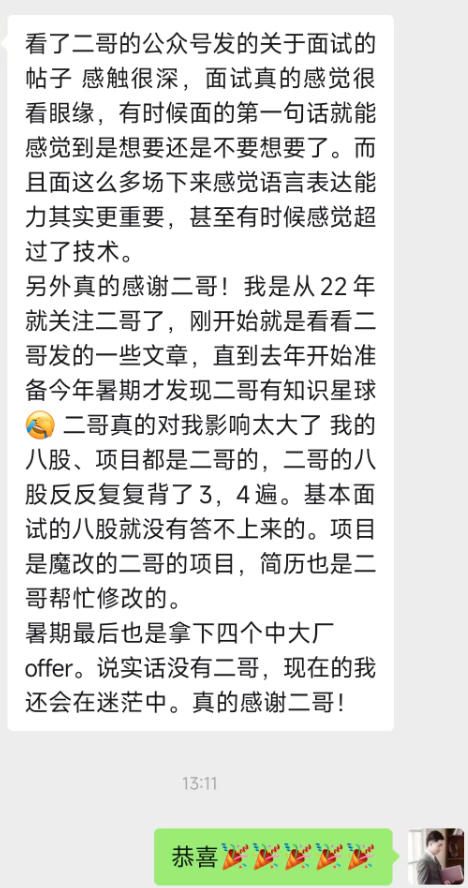 暑期最后也是拿下四个中大厂offer。说实话没有二哥,现在的我还会在迷茫中。真的感谢二哥!