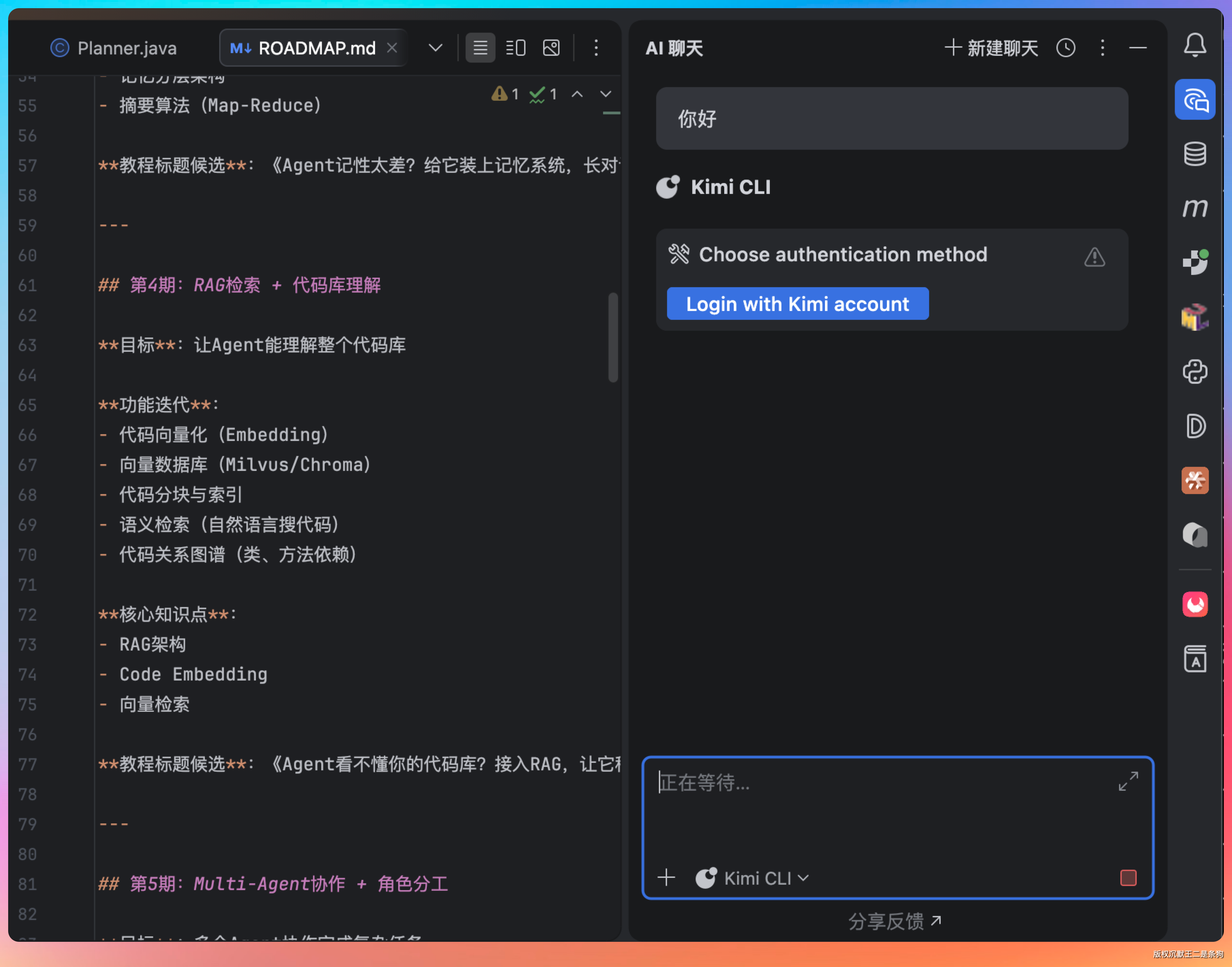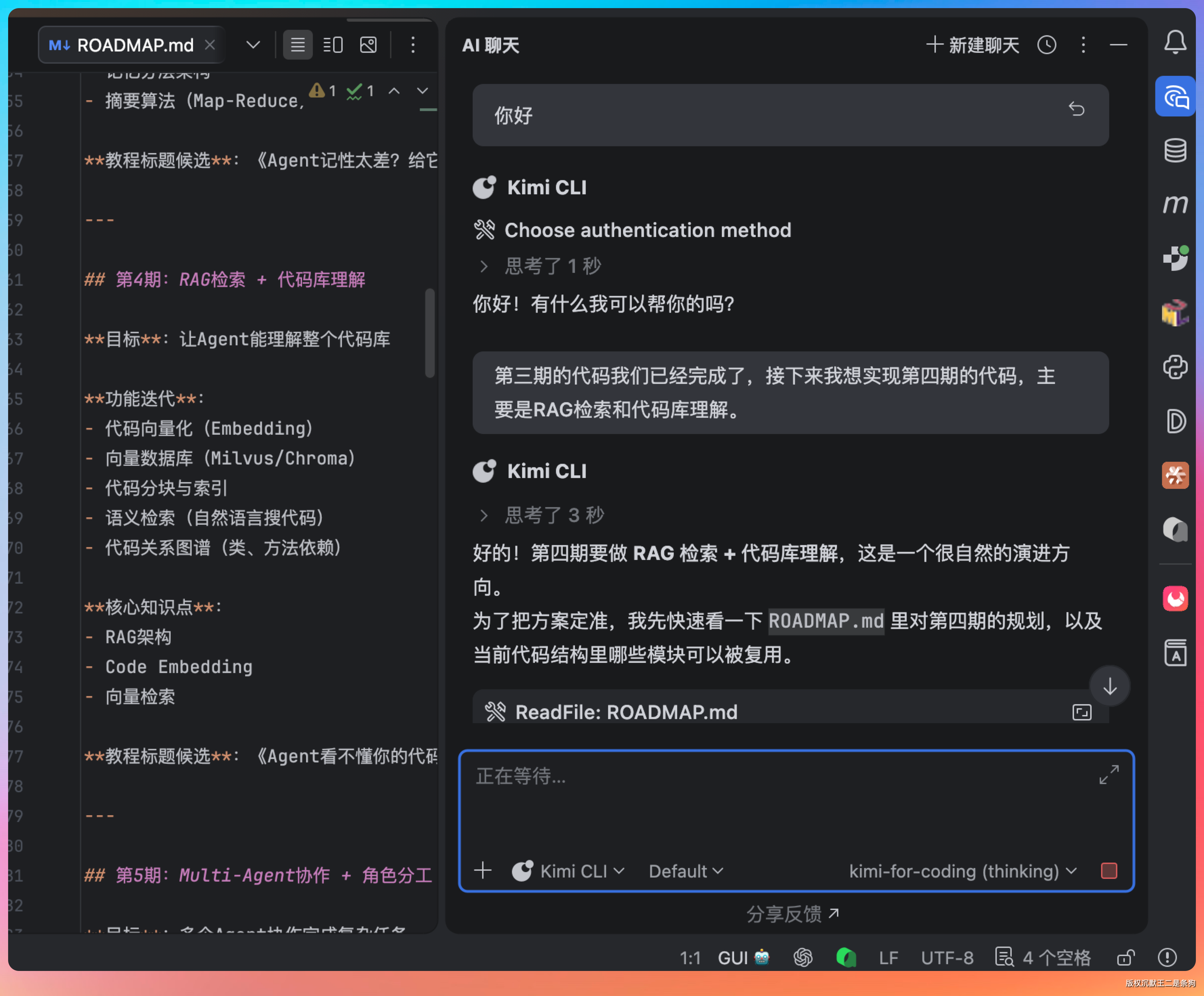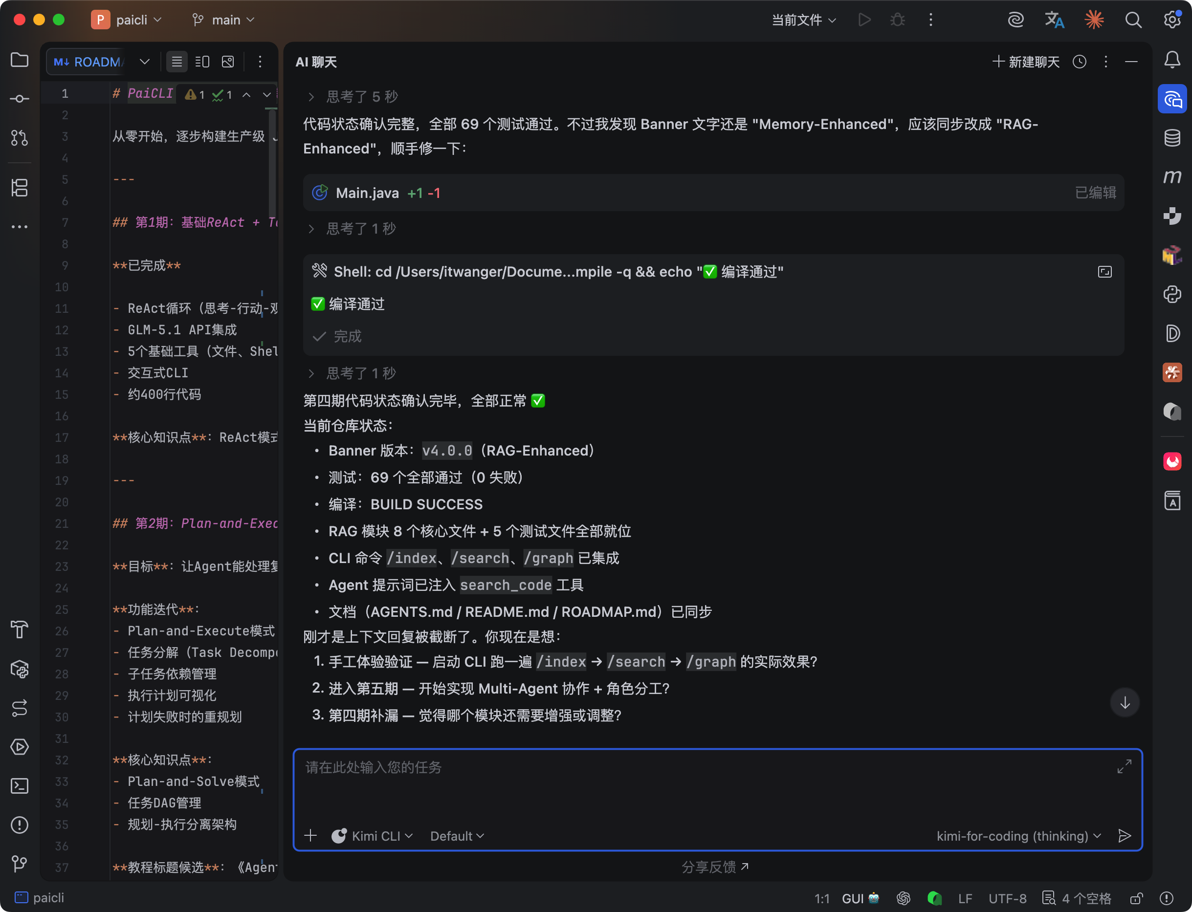 为了验证,我第一时间把 Kimi 2.6 接入到了 IntelliJ IDEA 中,并且让他完成了 PaiCLI Agent 实战项目的第四期 RAG 开发。
