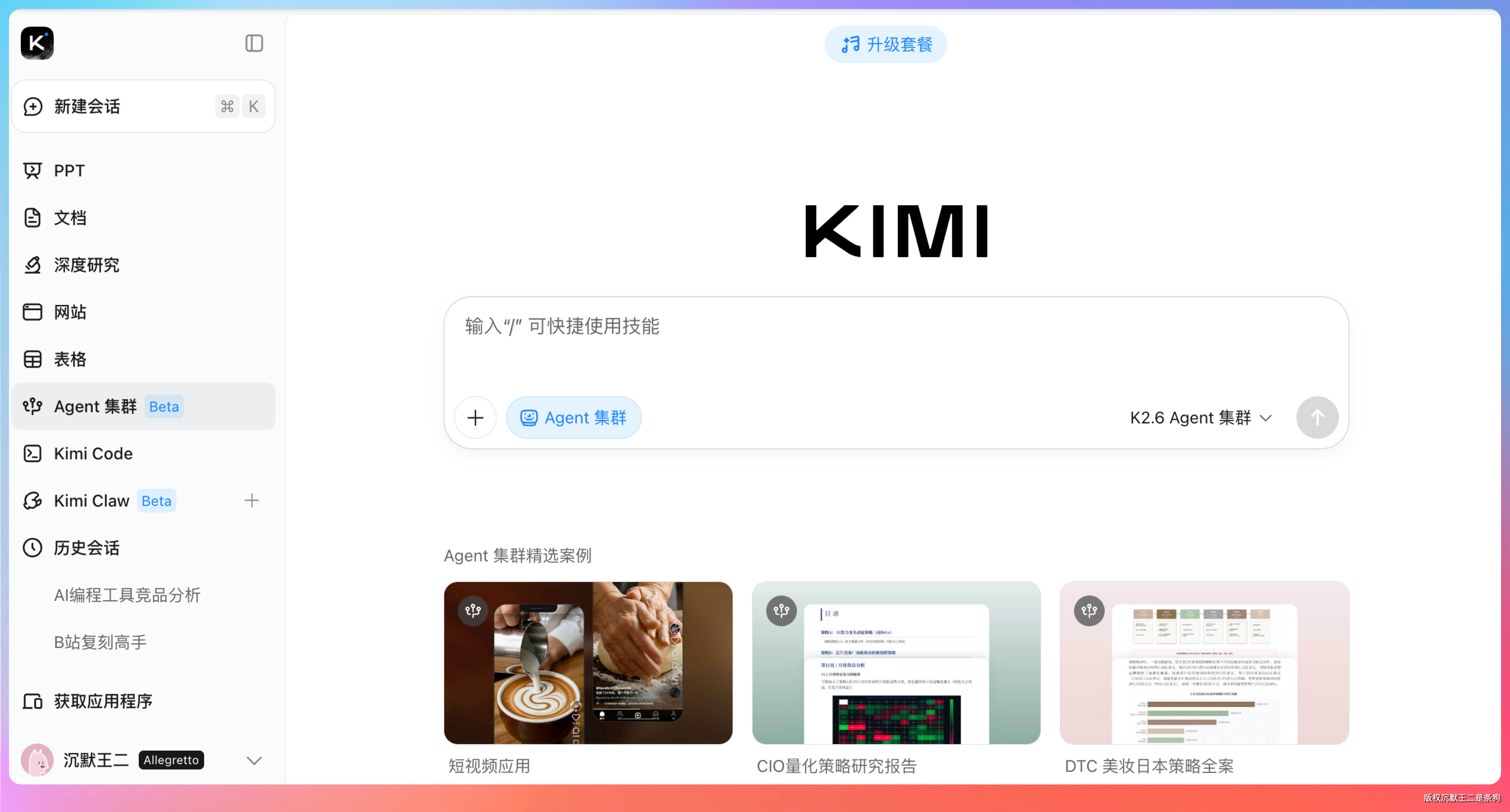 浏览器地址栏输入 kimi.com,进入 Agent 集群页面。