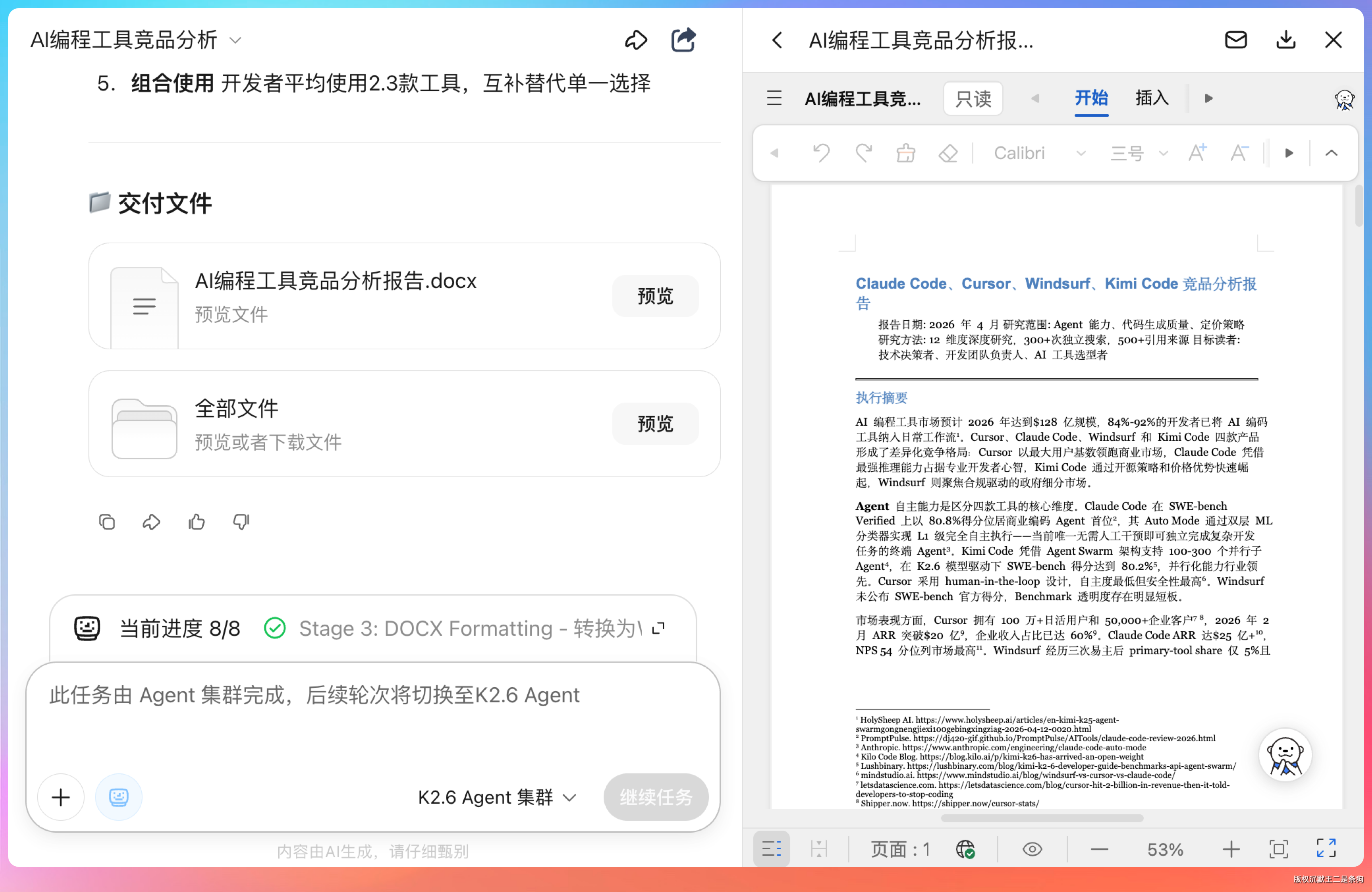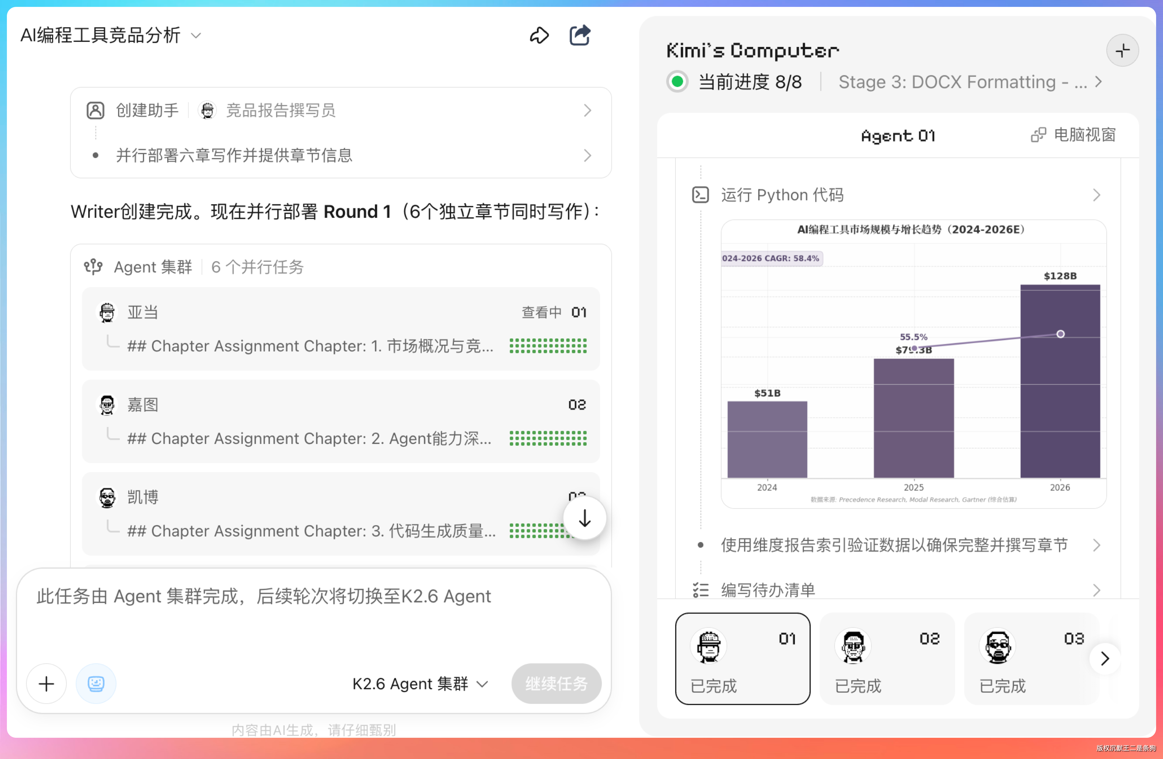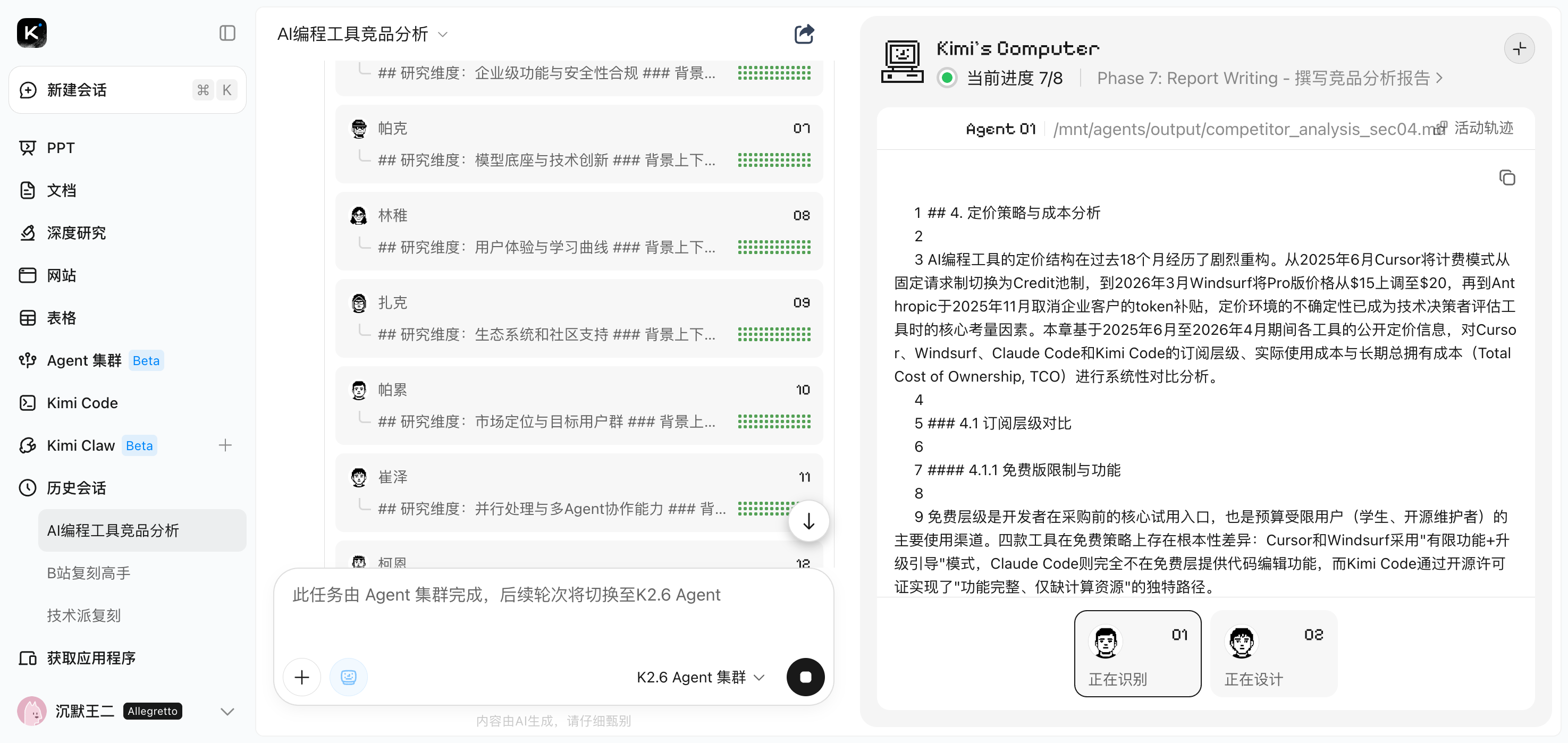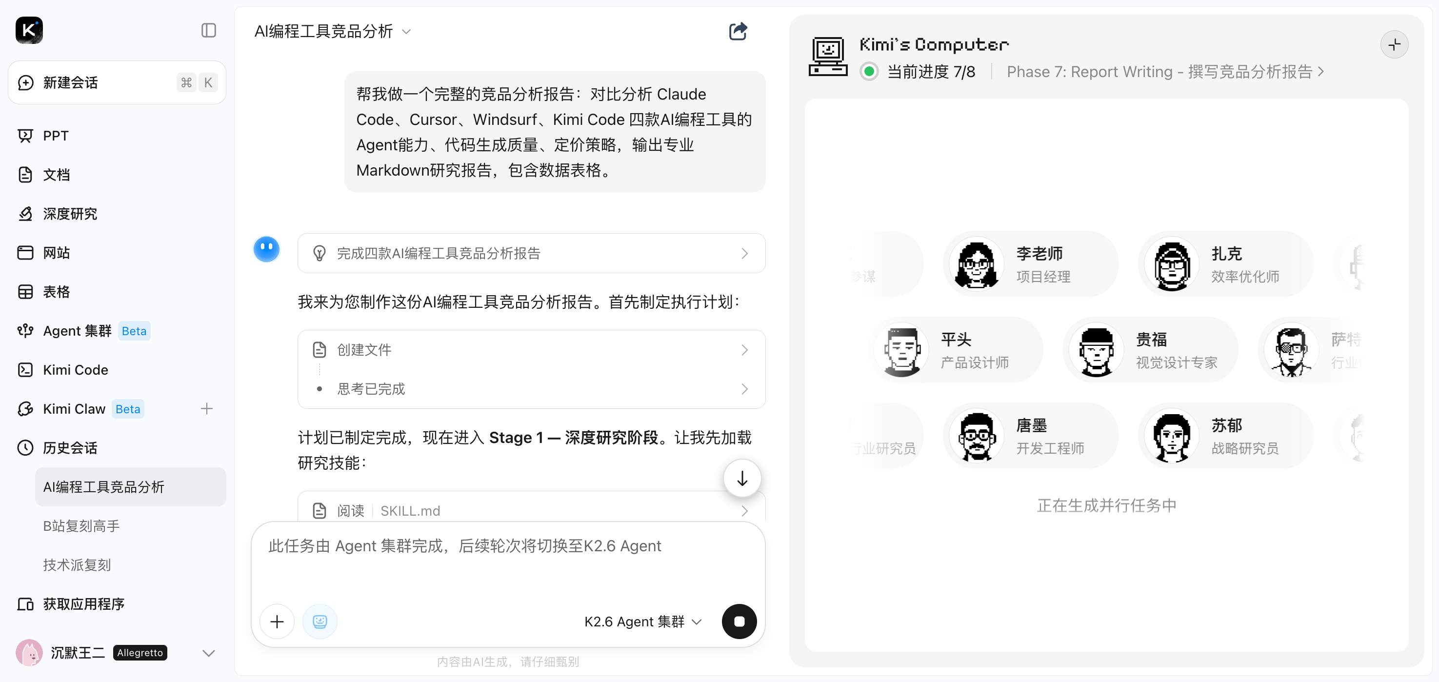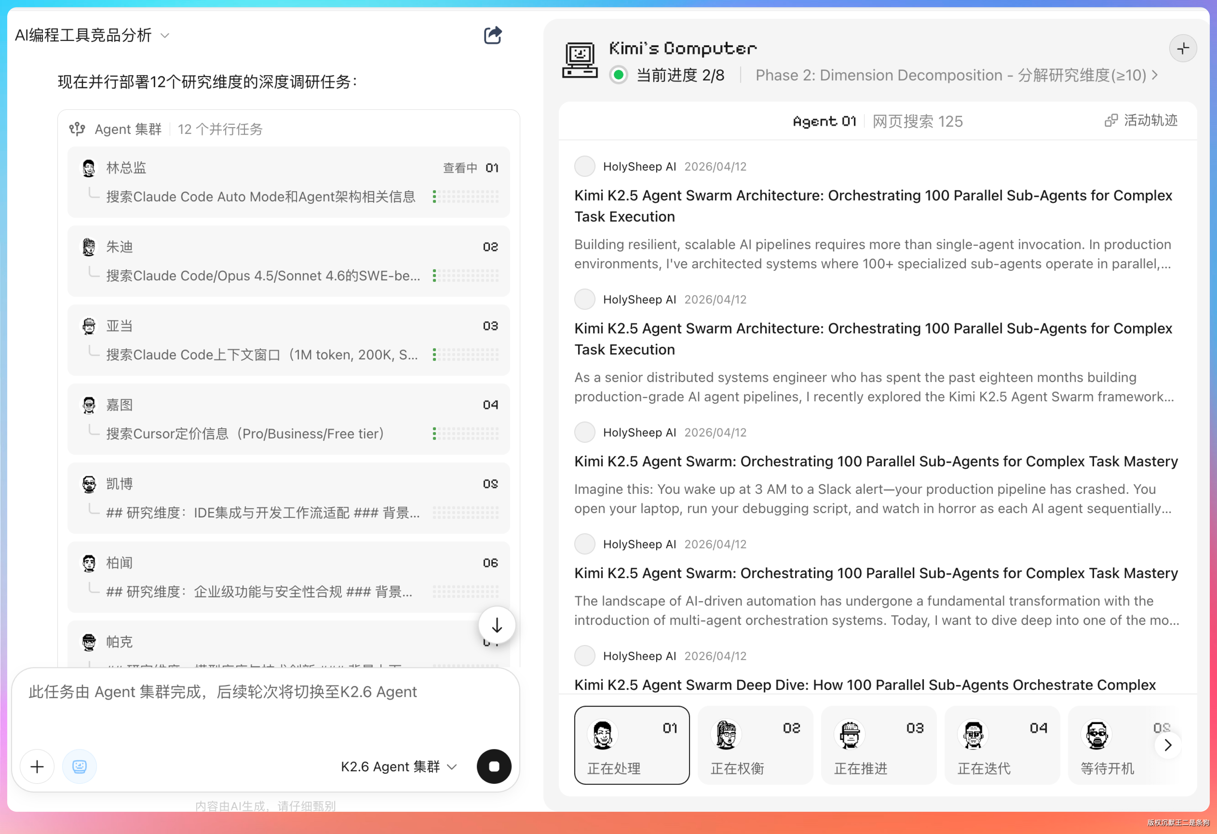 Kimi 先是自动拆解了一个执行计划——制定研究框架、深度研究、交叉验证,一直到报告组装和格式转换。然后就开始召唤 Agent 了。