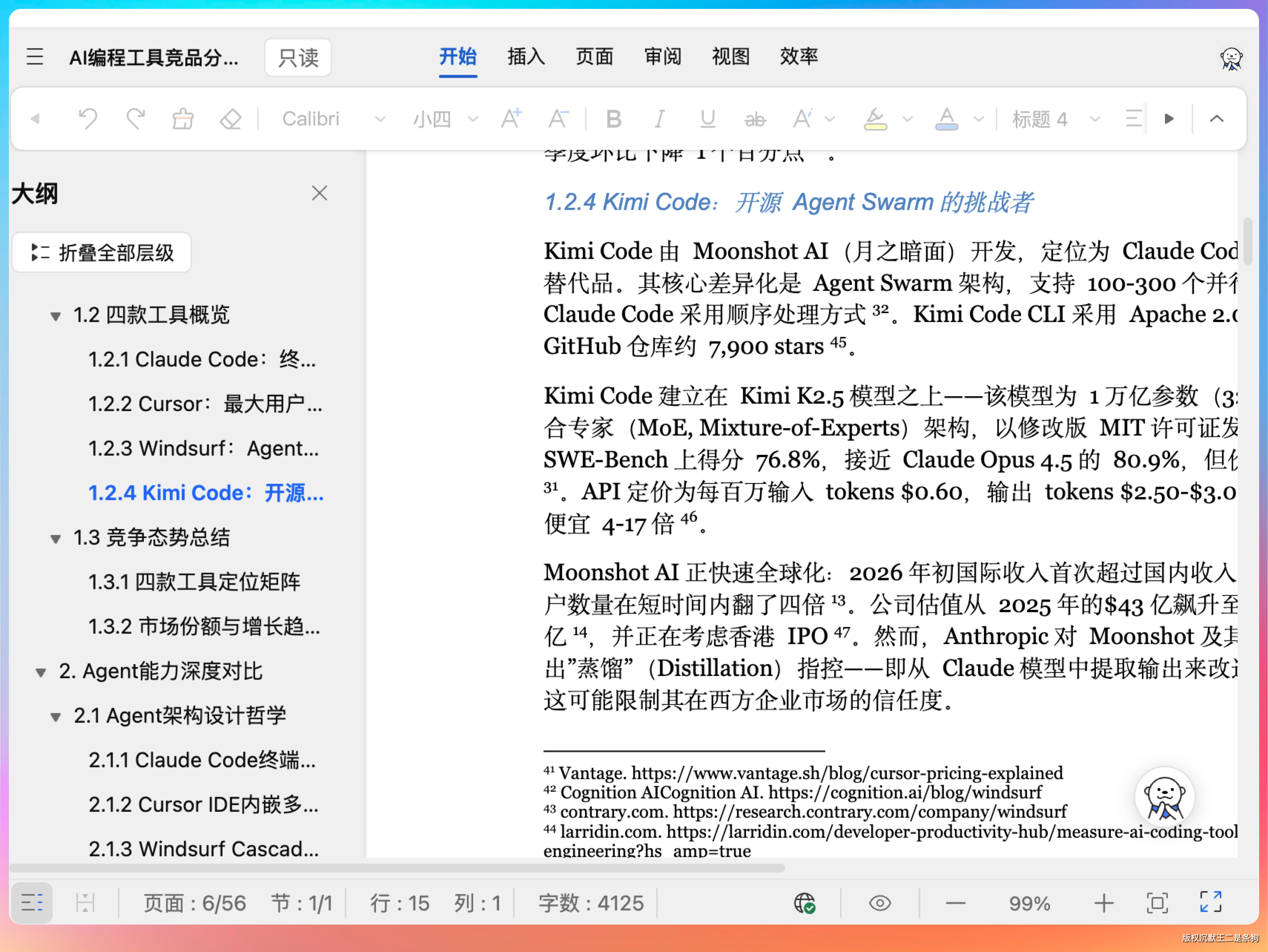 帮我做一个完整的竞品分析报告:对比分析 Claude Code、Cursor、Windsurf、Kimi Code 四款 AI 编程工具的 Agent 能力、代码生成质量、定价策略,输出专业 Markdown 研究报告,包含数据表格。