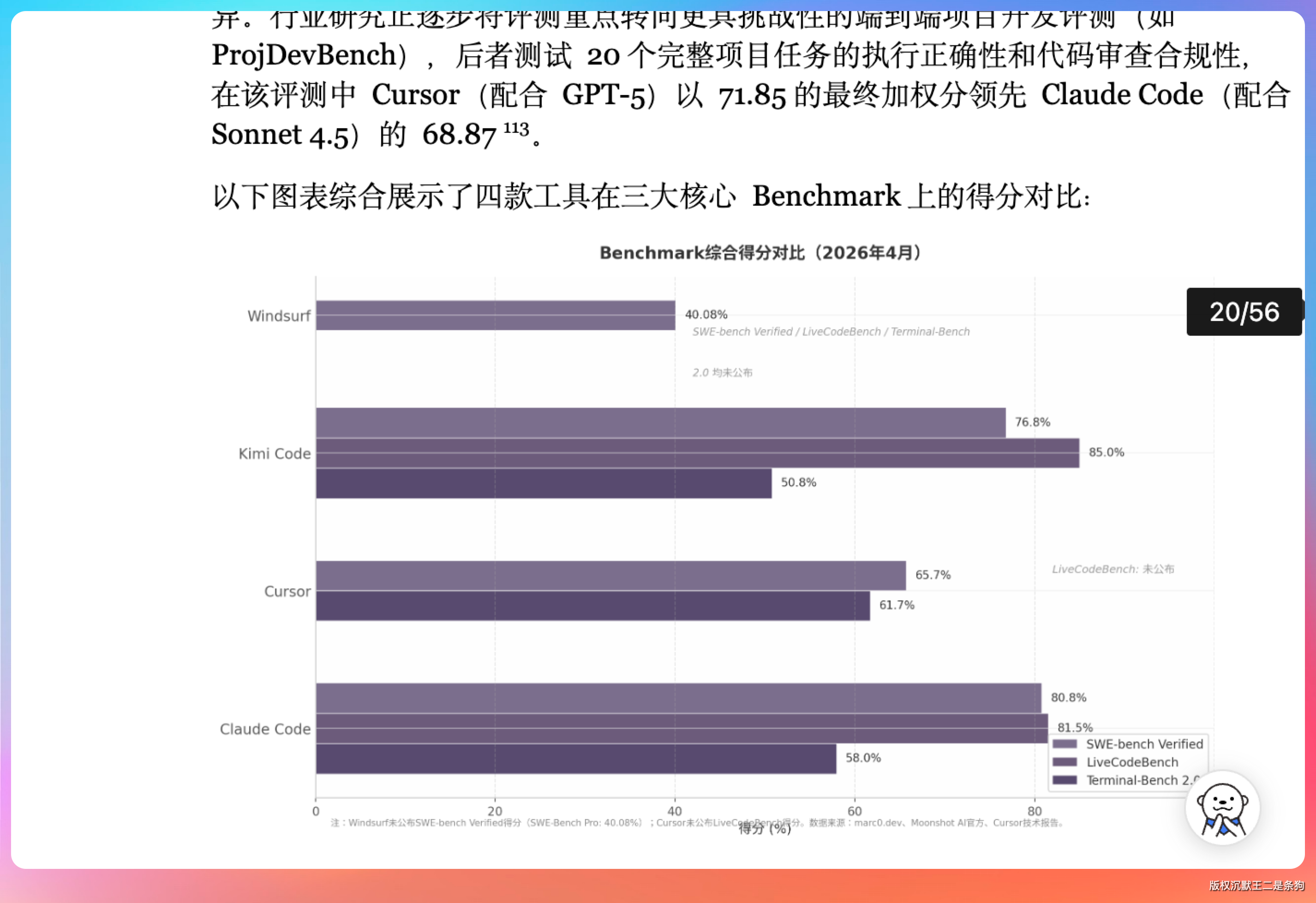 翻了一下最终报告,内容大致分这么几块:四款工具的 Agent 架构对比、代码生成质量的 benchmark 数据、定价策略横向对比表、IDE 集成完整度评估、企业级功能支持情况。