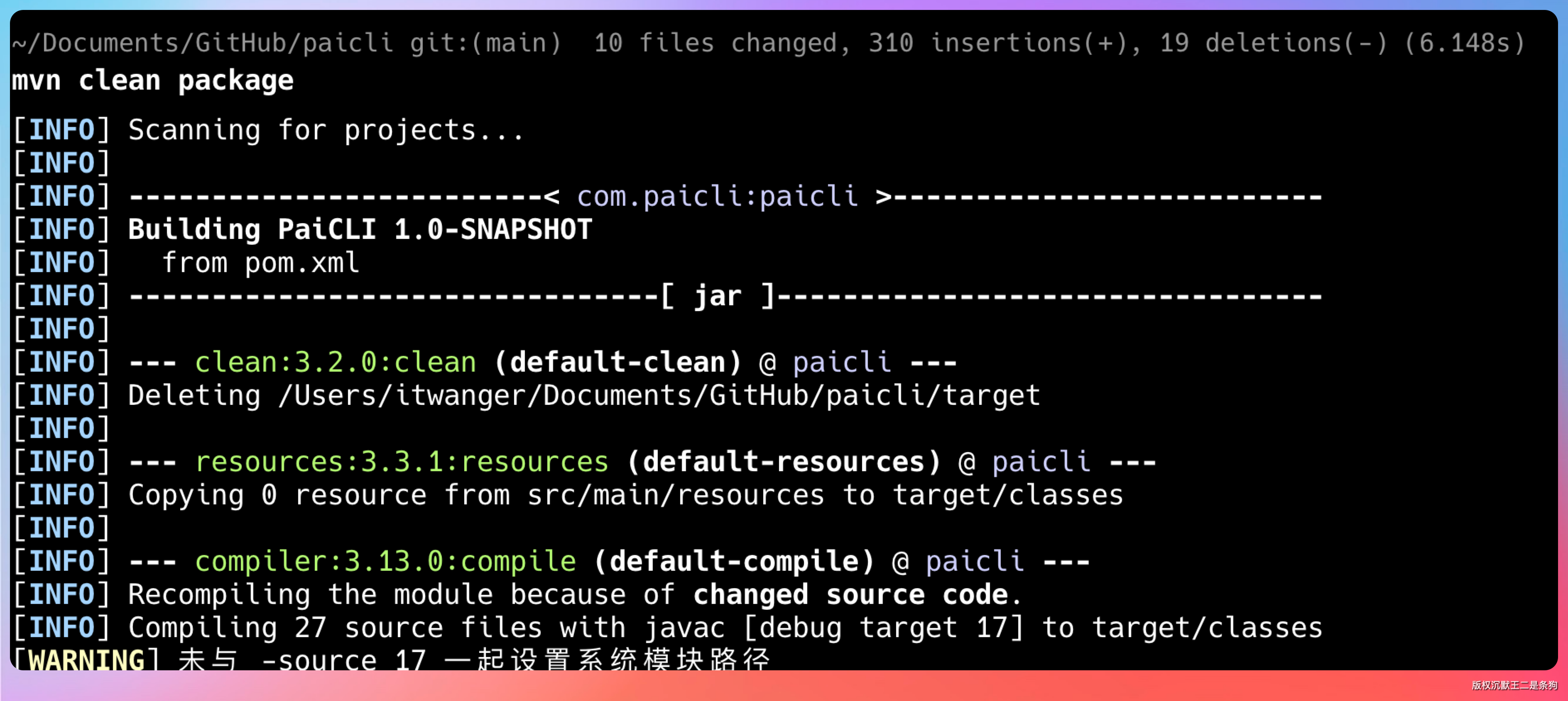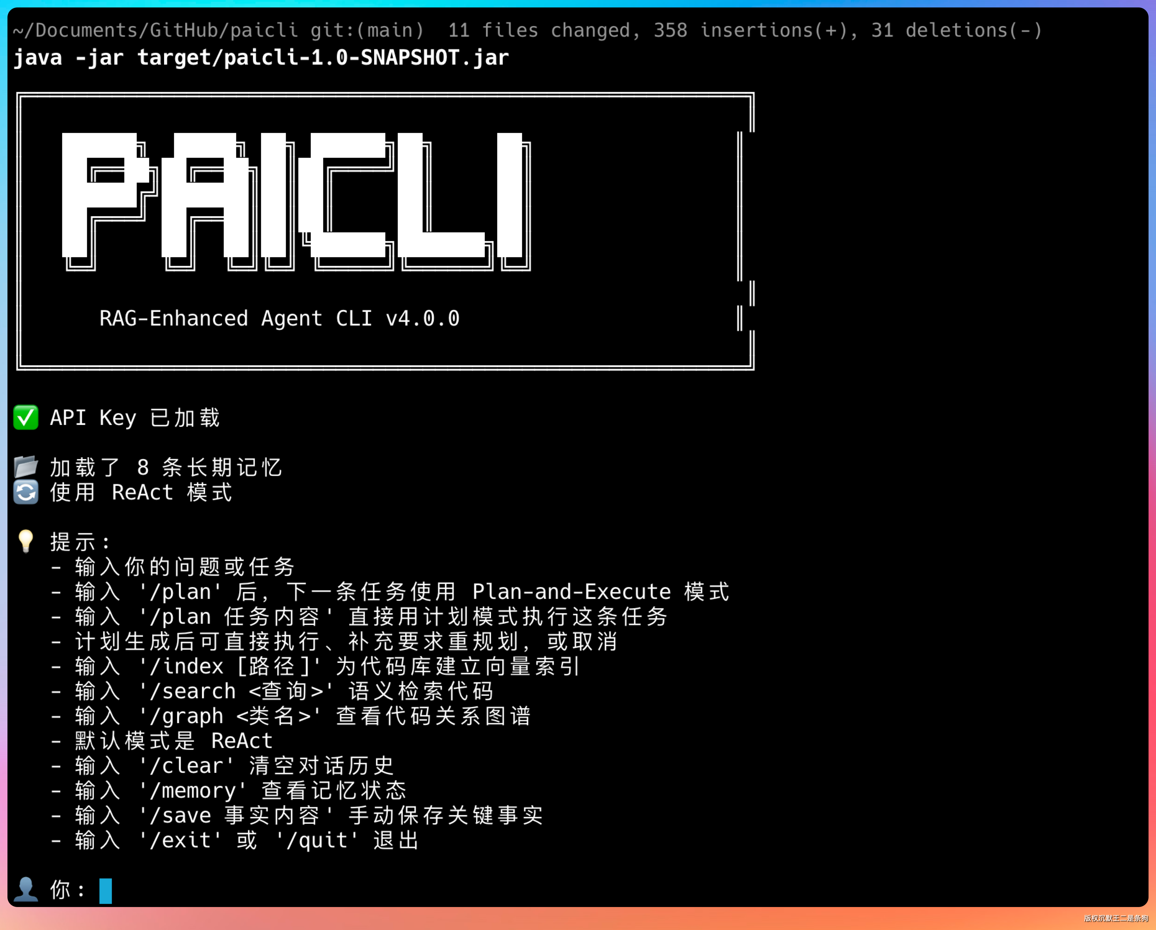 build 没问题后,我们执行 java -jar target/paicli-1.0-SNAPSHOT.jar 进入 PaiCLI。
