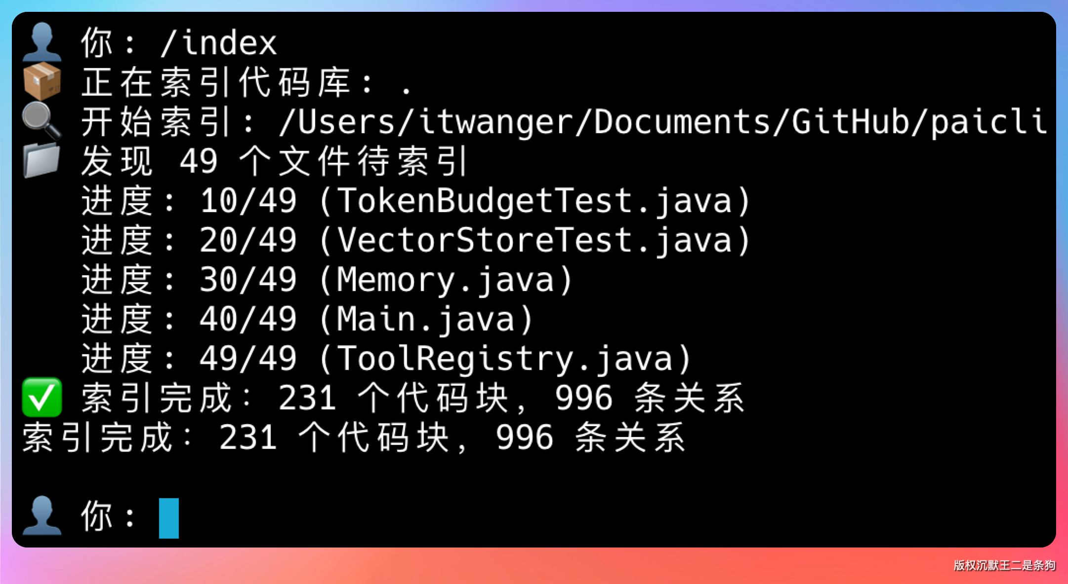 输入 /index 命令,看看能不能正确地把当前代码库的结构和内容索引到向量数据库里。