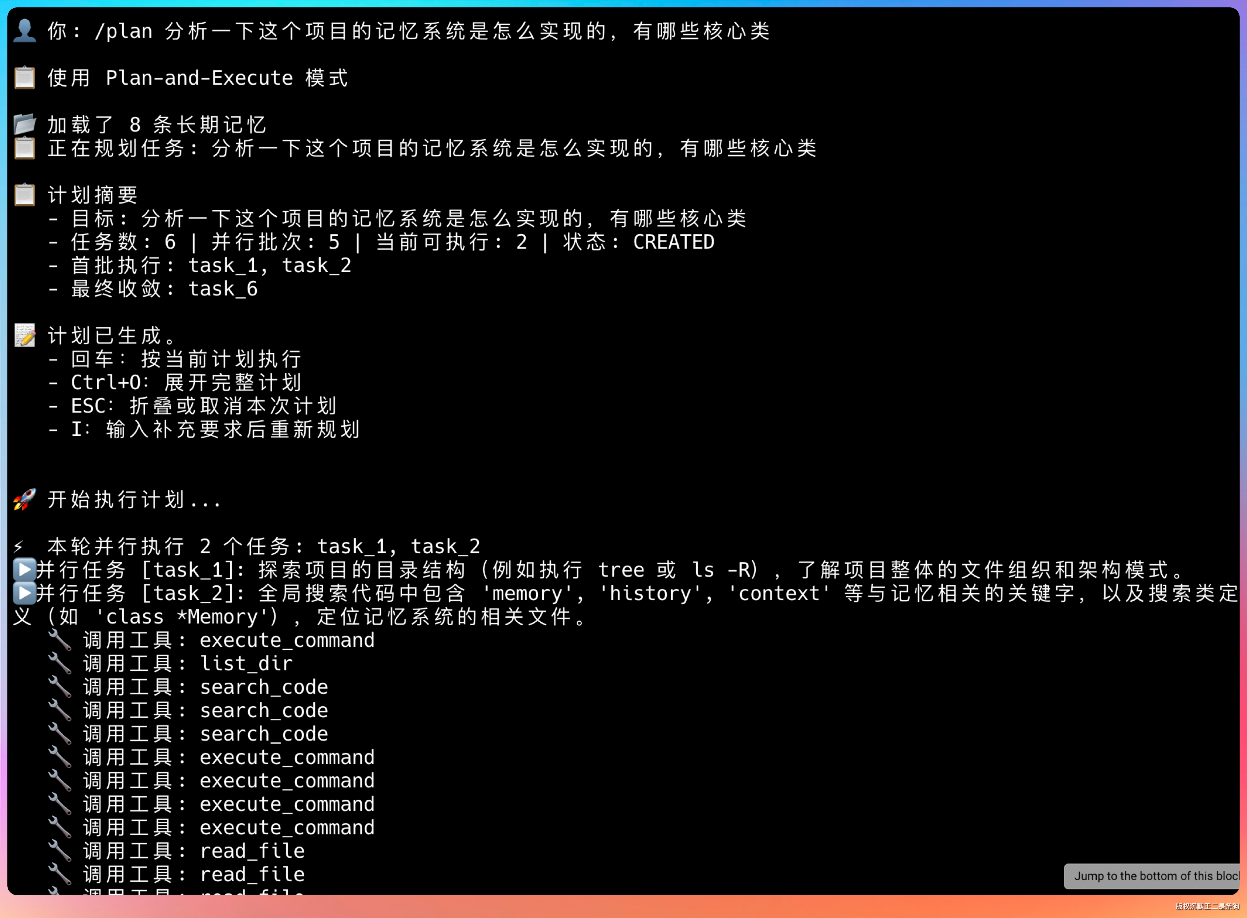 /plan 分析一下这个项目的记忆系统是怎么实现的,有哪些核心类 验证 Plan 模式下 Agent 自动调用 search_code 工具检索记忆相关代码,然后基于检索结果给出分析。