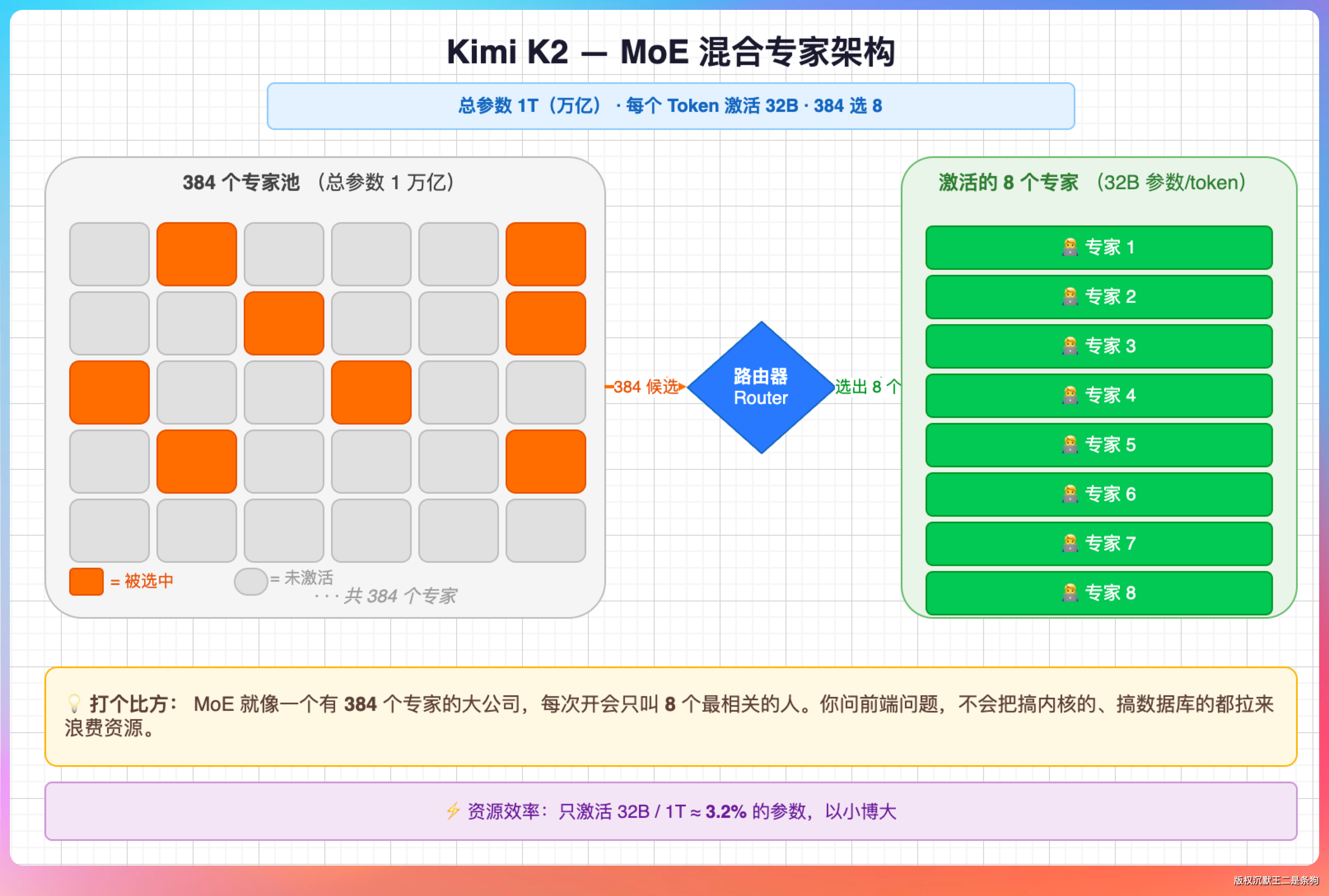 说人话就是,MoE 就像一个大公司里有 384 个专家,但每次开会只叫 8 个最相关的人来参加讨论。