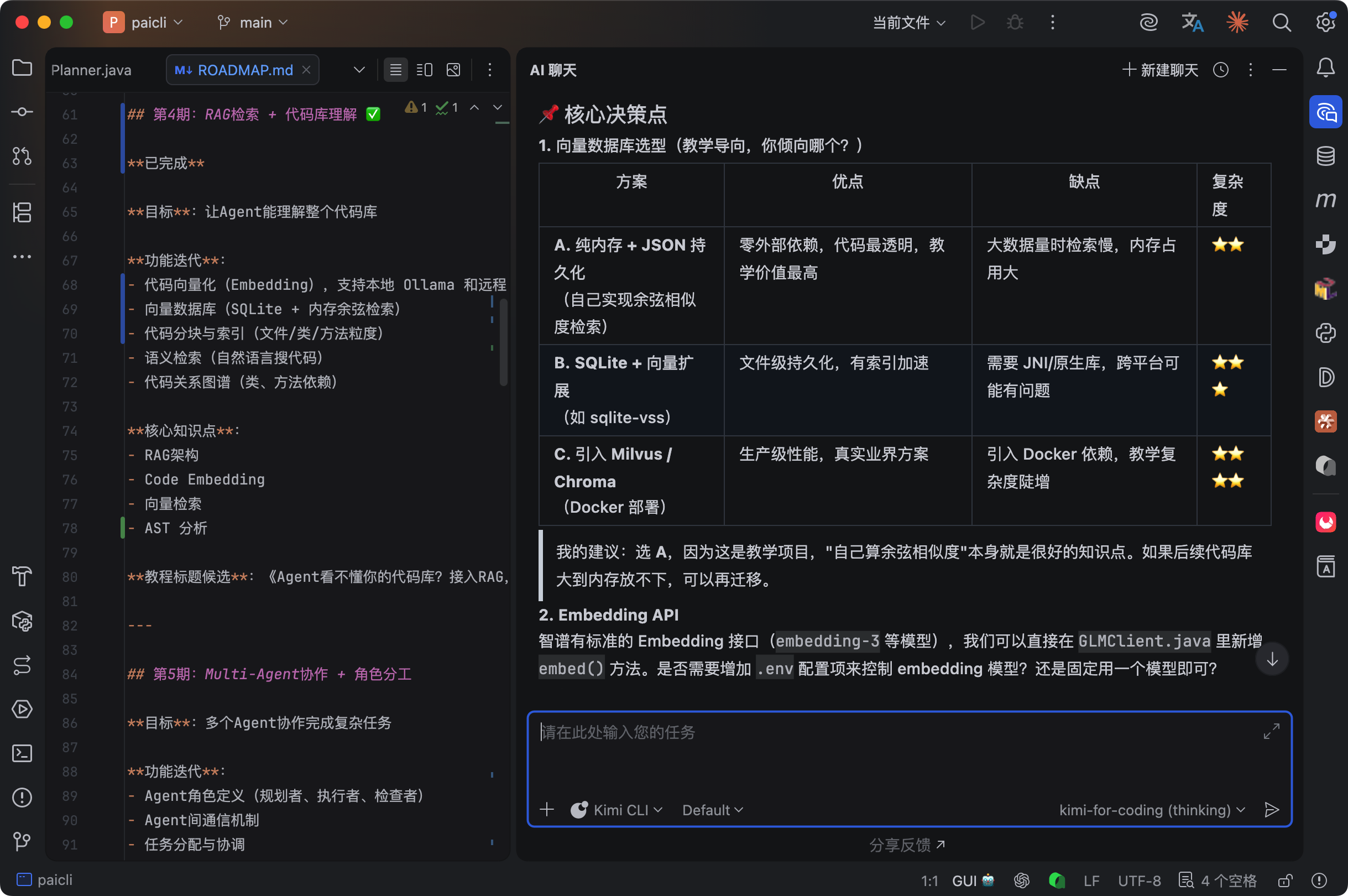 Kimi 分析完需求后主动问了我几个方案选型的问题:向量数据库用纯内存、SQLite 还是 Milvus?Embedding API 选哪家供应商?代码解析要不要引入 AST 解析?Embedding 模型是否需要可配置?