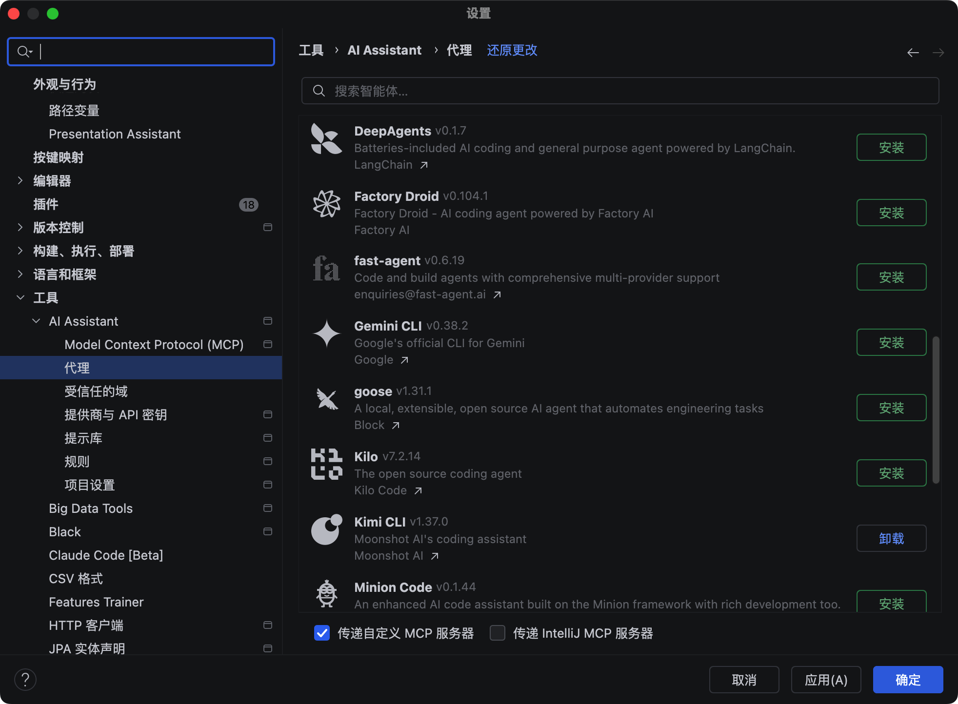 打开 IntelliJ IDEA,在【工具】→【AI Assistant】→【代理】中,找到 Kimi CLI,点击【安装】。