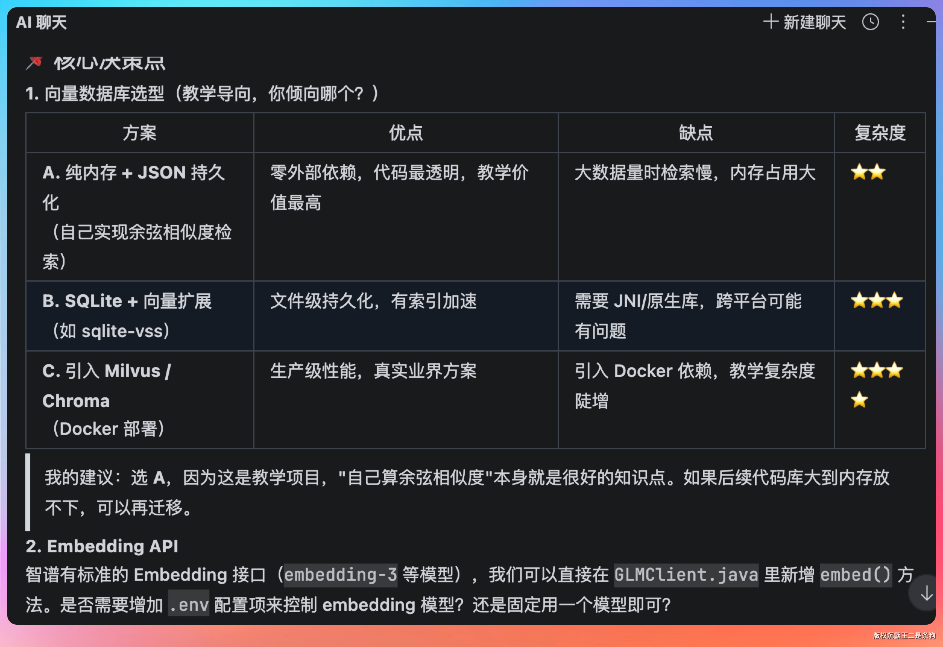 每一个都直接影响后续的架构设计——选 SQLite 还是 Milvus,意味着你这个项目是单机部署还是分布式部署,后面的代码实现完全不一样。