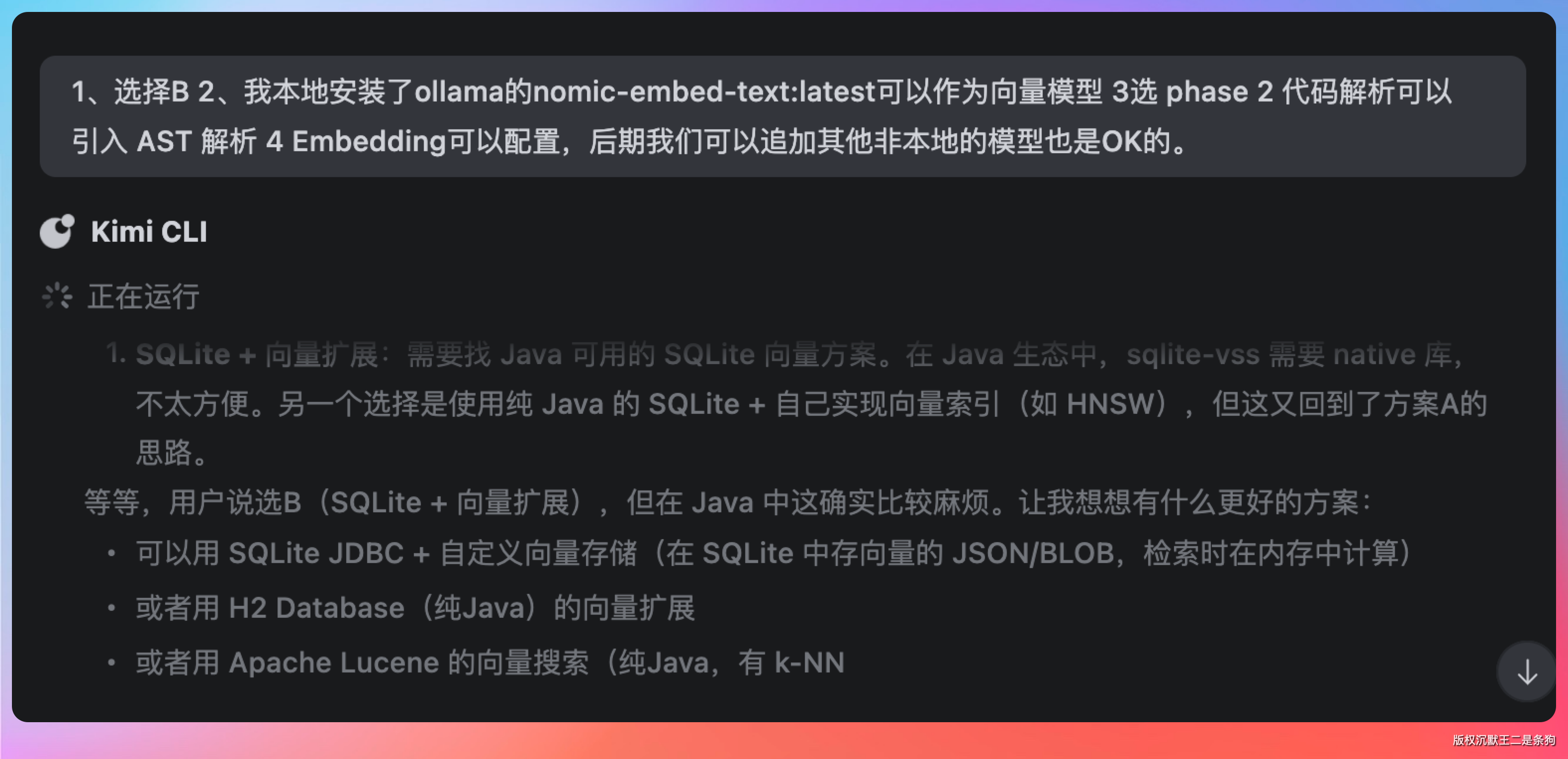 我的回复是:选 SQLite、本地用 ollama 的 nomic-embed-text 作为向量模型、引入 AST 解析、Embedding 模型可配置。