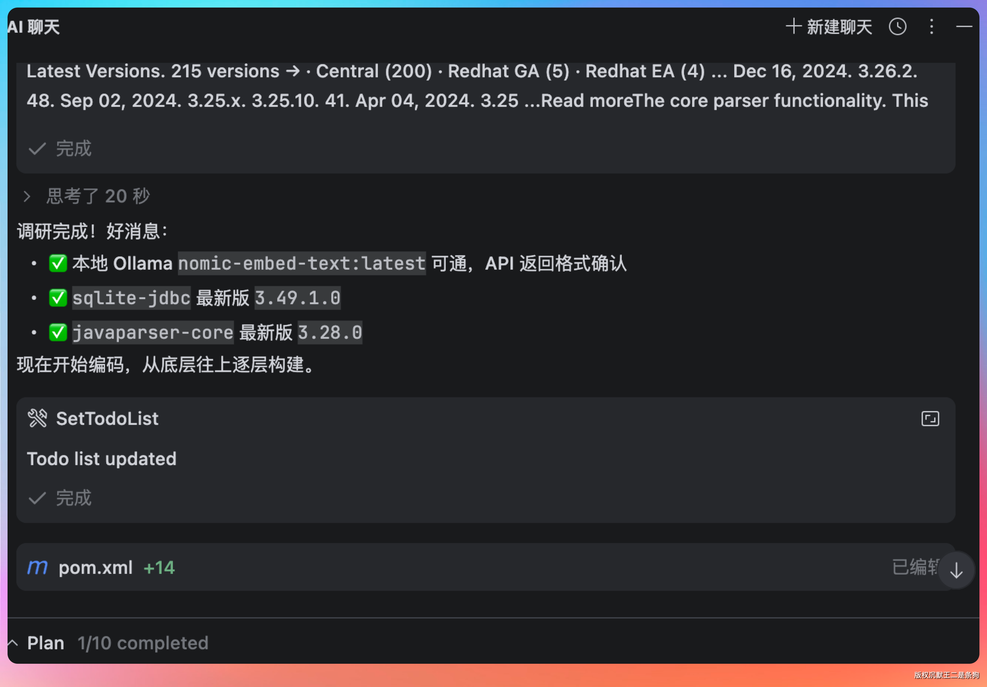 全部索引成功,太牛 x 了。索引过程中会自动做 AST 解析,把每个 Java 文件拆成文件级、类级、方法级三层 chunk,然后通过 Ollama 的 nomic-embed-text 模型转成向量,存进 SQLite。整个流程是自动化的,不需要手动配置任何东西。