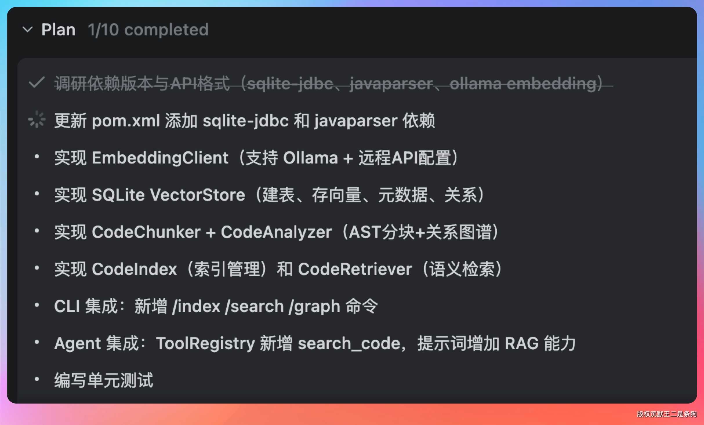 第三阶段是用户界面——给 Agent CLI 添加 /index、/search、/graph 等斜杠命令,以及把 RAG 能力集成进 Agent。