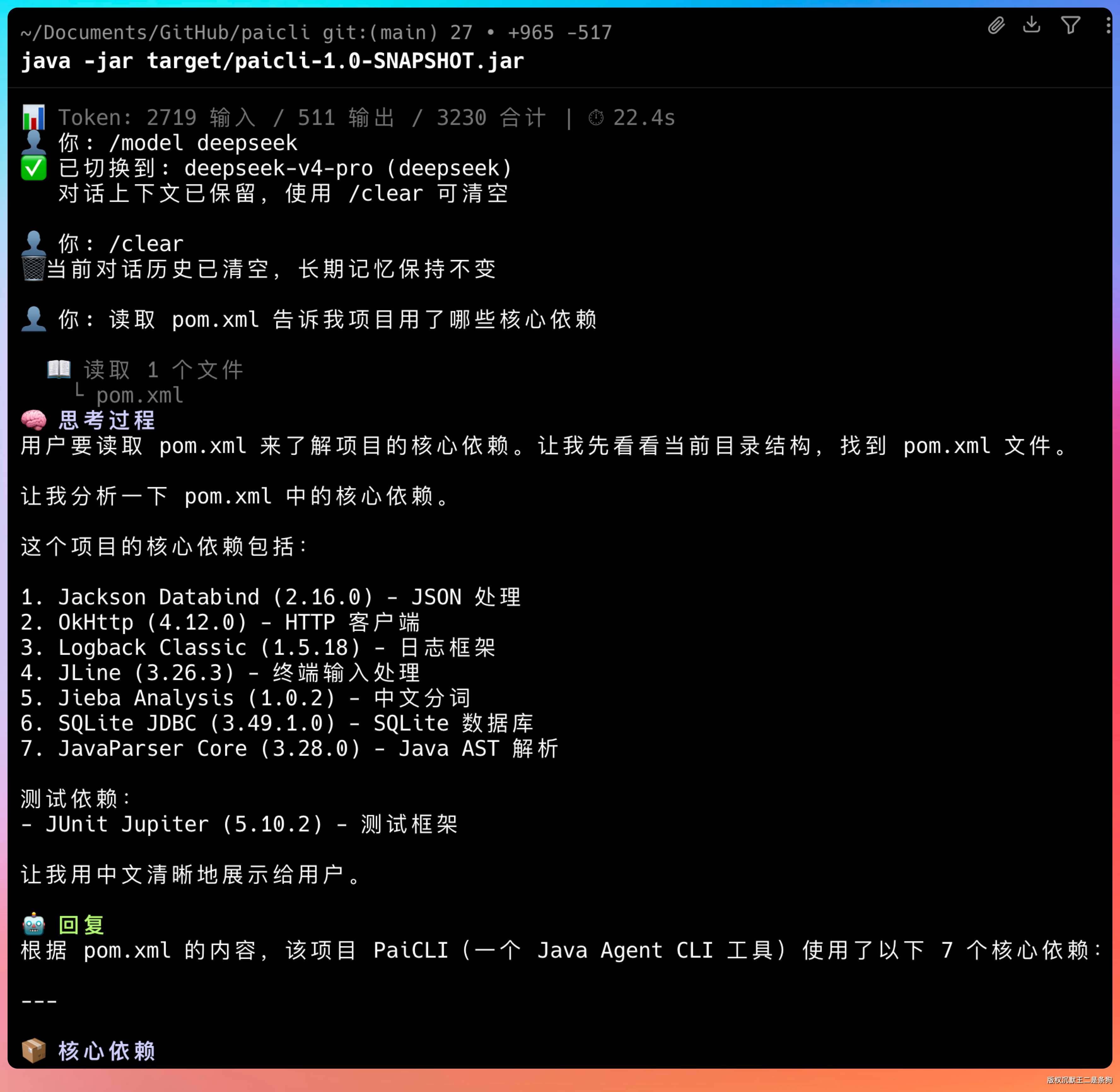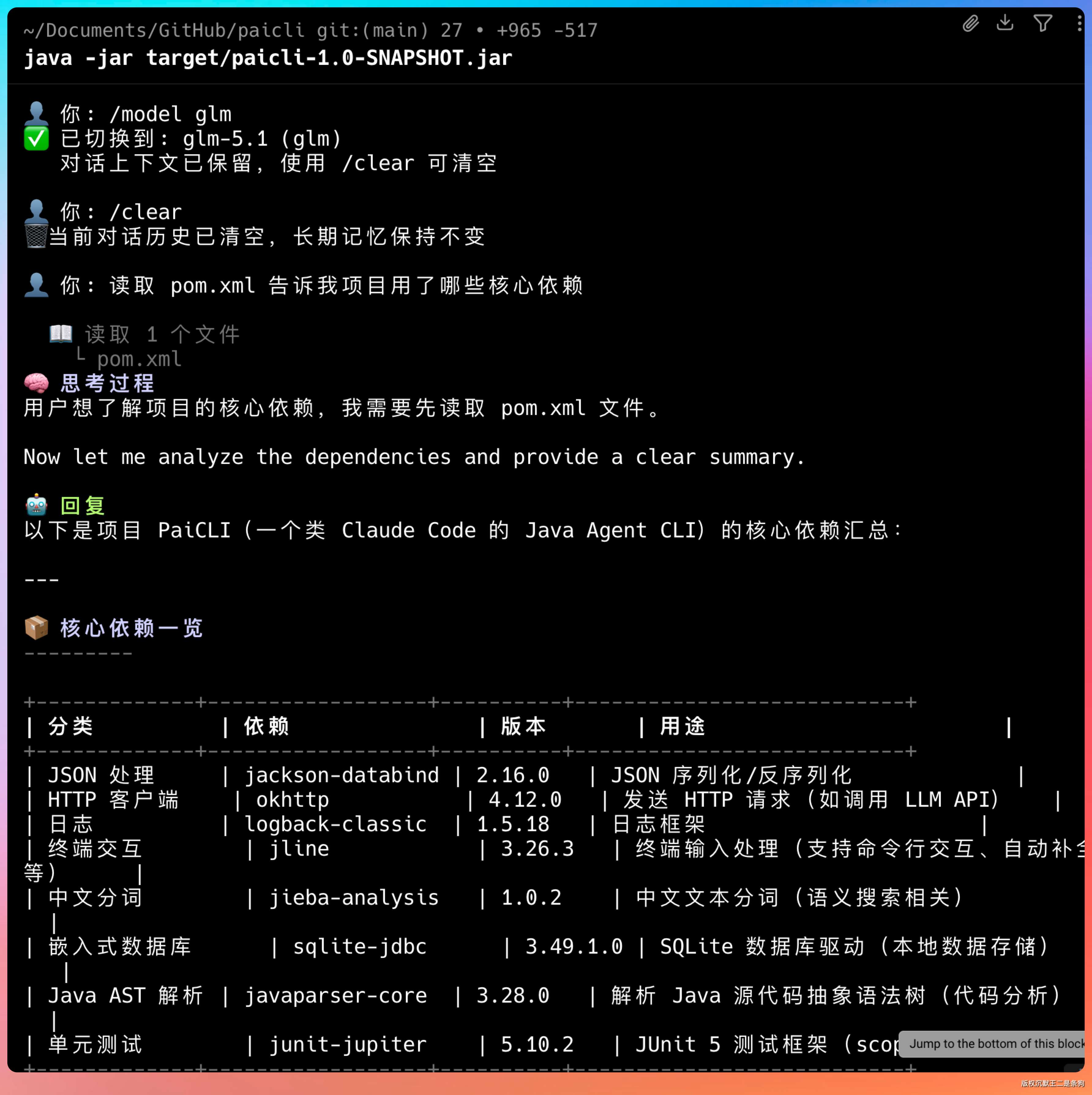 任务是让 PaiCLI 分析项目的 pom.xml,找出核心依赖并给出简要说明。这个任务刚好能覆盖工具调用(read_file)和文本生成两个环节,可以同时对比工具使用策略和回答质量。