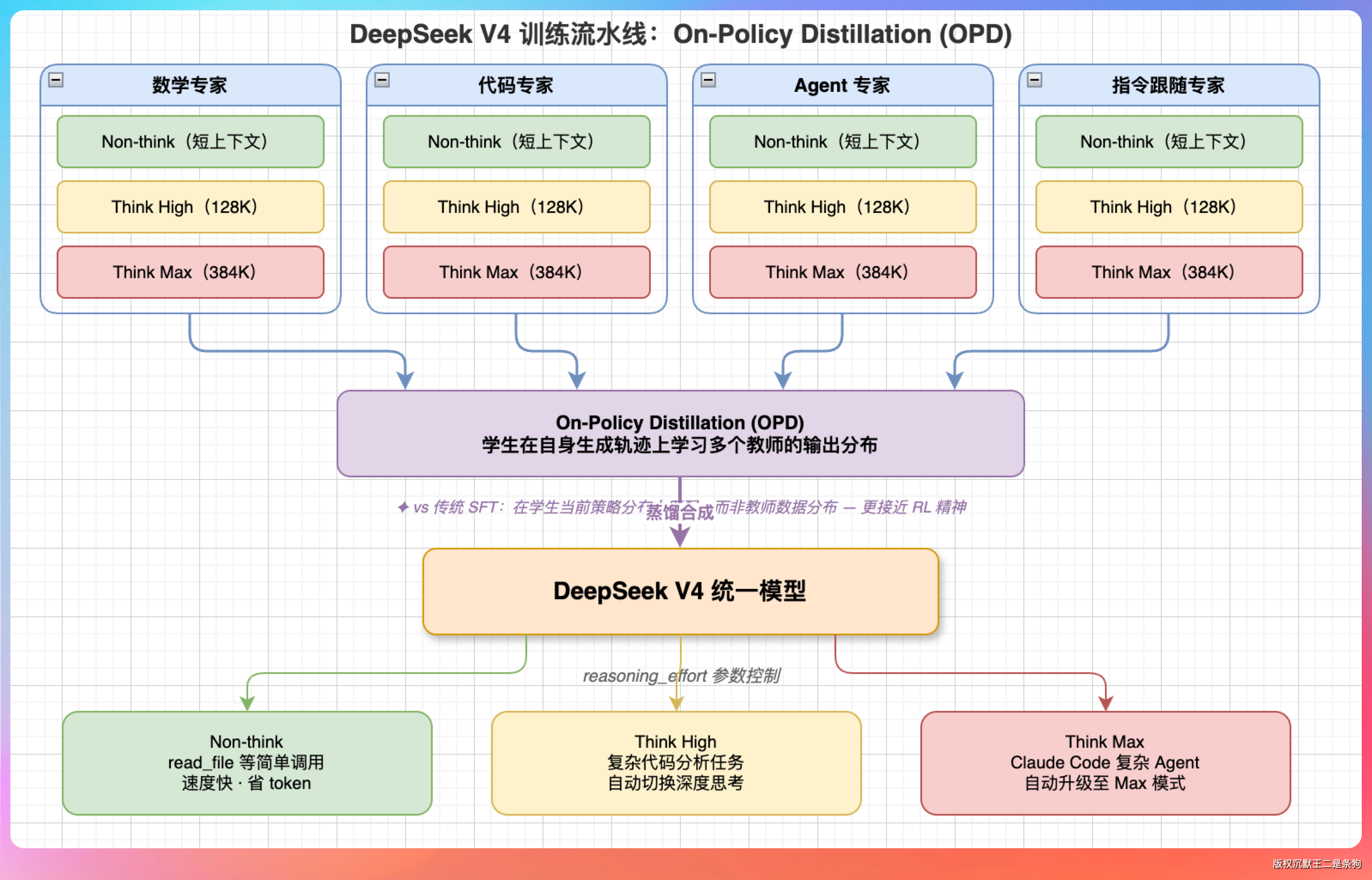 训练方法上 V4 做了一个大胆的范式切换:后训练阶段不再用之前 V3.2 那套混合强化学习,改成了一种叫 On-Policy Distillation(OPD) 的方法。