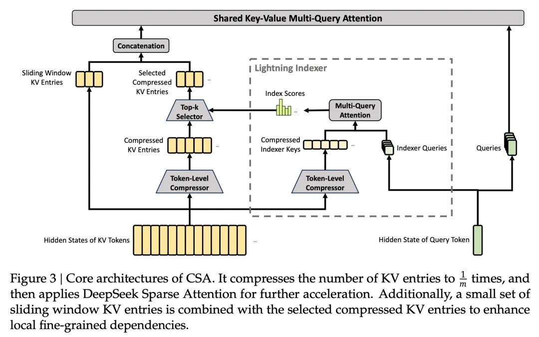 第一个是CSA(Compressed Sparse Attention)。它先把相邻的几个 token 压缩在一起(Flash 版本里每 4 个 token 压一块),然后每个 query 只挑最相关的几百个压缩块来看。打个比方,100 万 token 先压成 25 万块,再从中只挑 512 块做注意力计算,相当于只看了原文的千分之二,计算量断崖式下降。