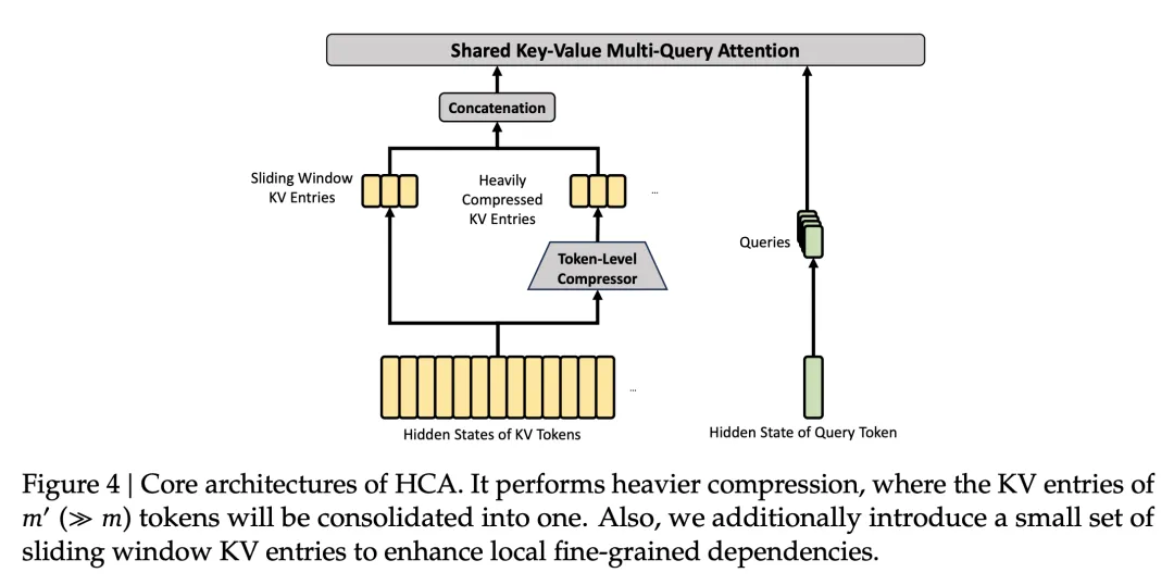 CSA 负责精确检索远处的信息,HCA 负责维持对全局的大致把握。另外每层还带了一个滑动窗口分支专门处理附近的 token,防止压缩把局部的前后文关系搞丢。