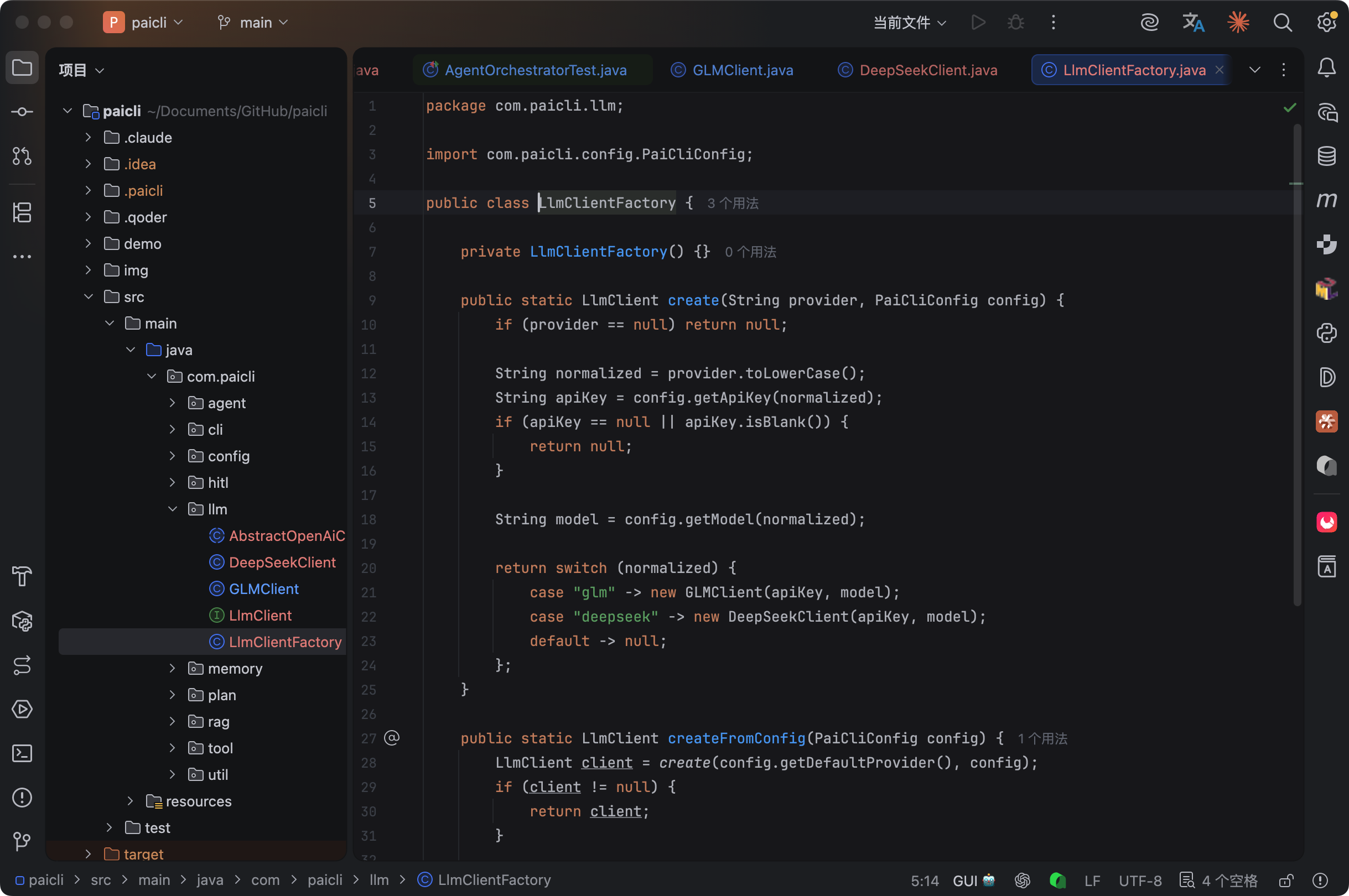 工厂模式:LlmClientFactory 封装了客户端的创建逻辑。