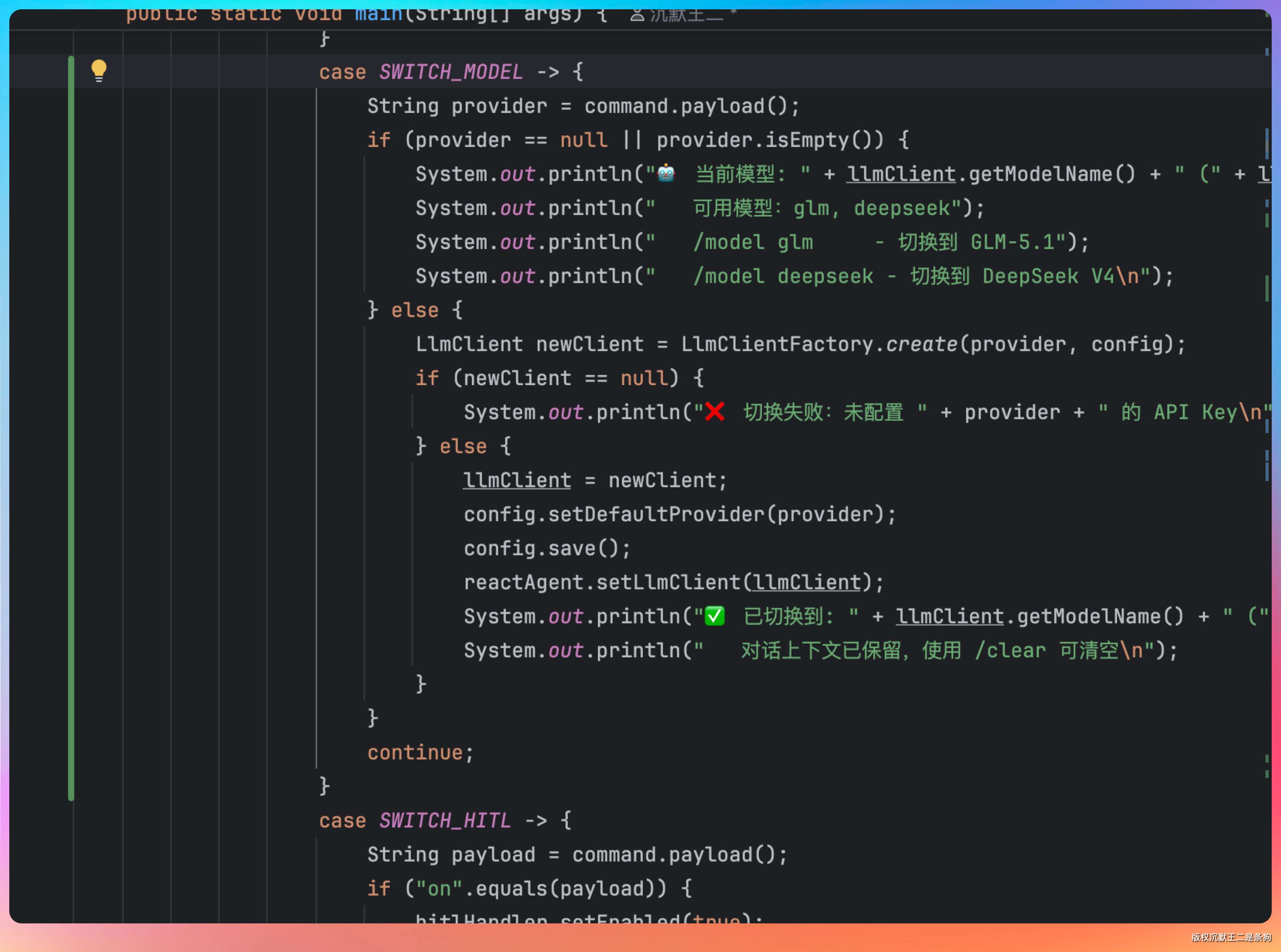 Agent 里的实现很简单,llmClient 字段从 final 改为可变,setLlmClient 同时更新 MemoryManager 内部的引用: