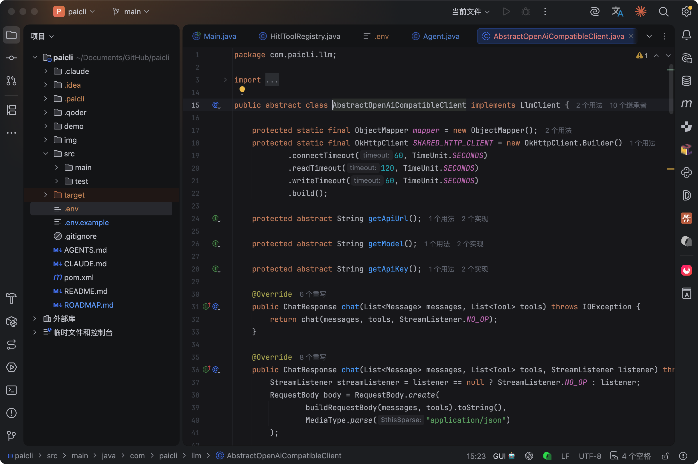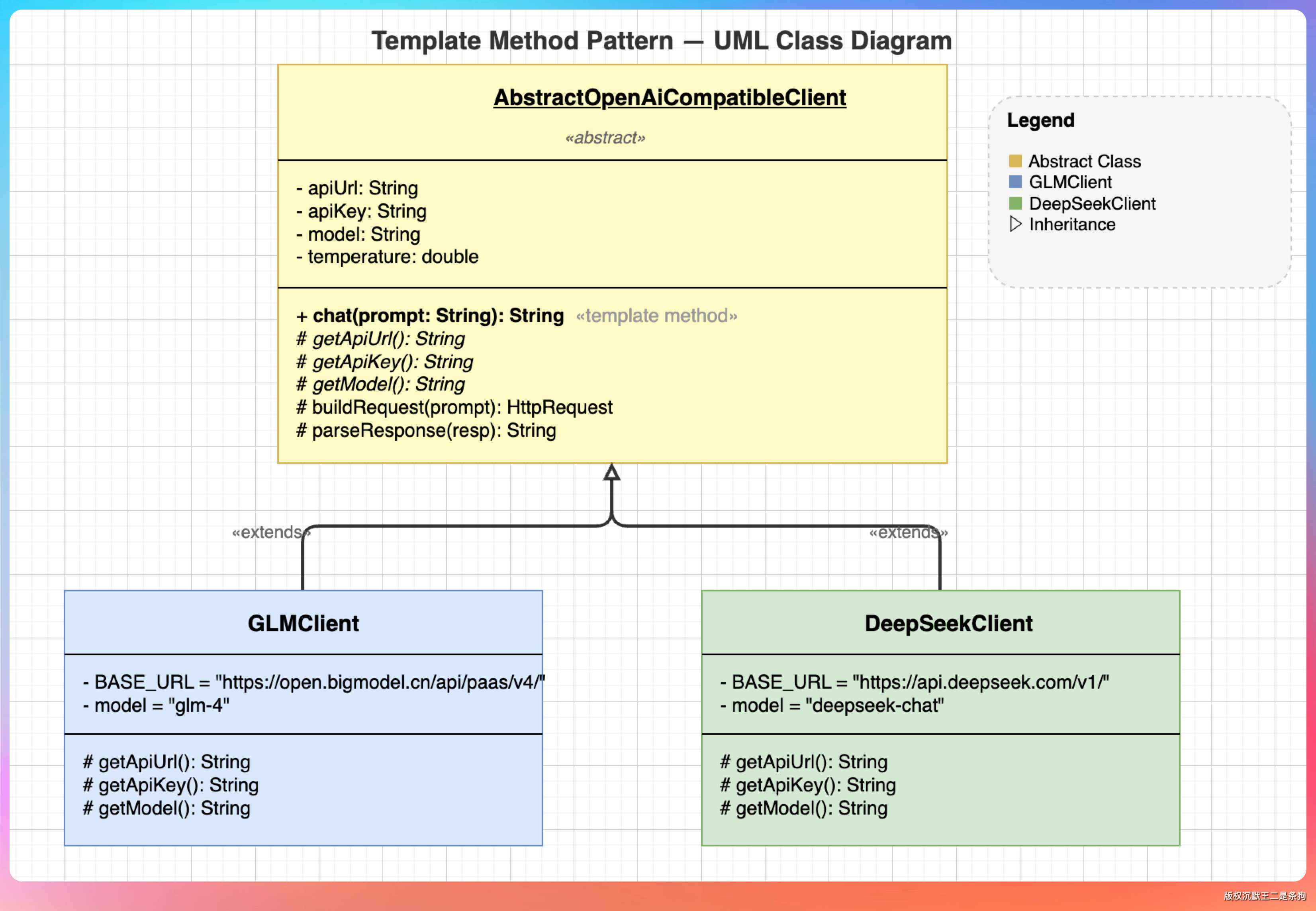 所以我们用模板方法模式,把共享逻辑抽到基类 AbstractOpenAiCompatibleClient 里:
