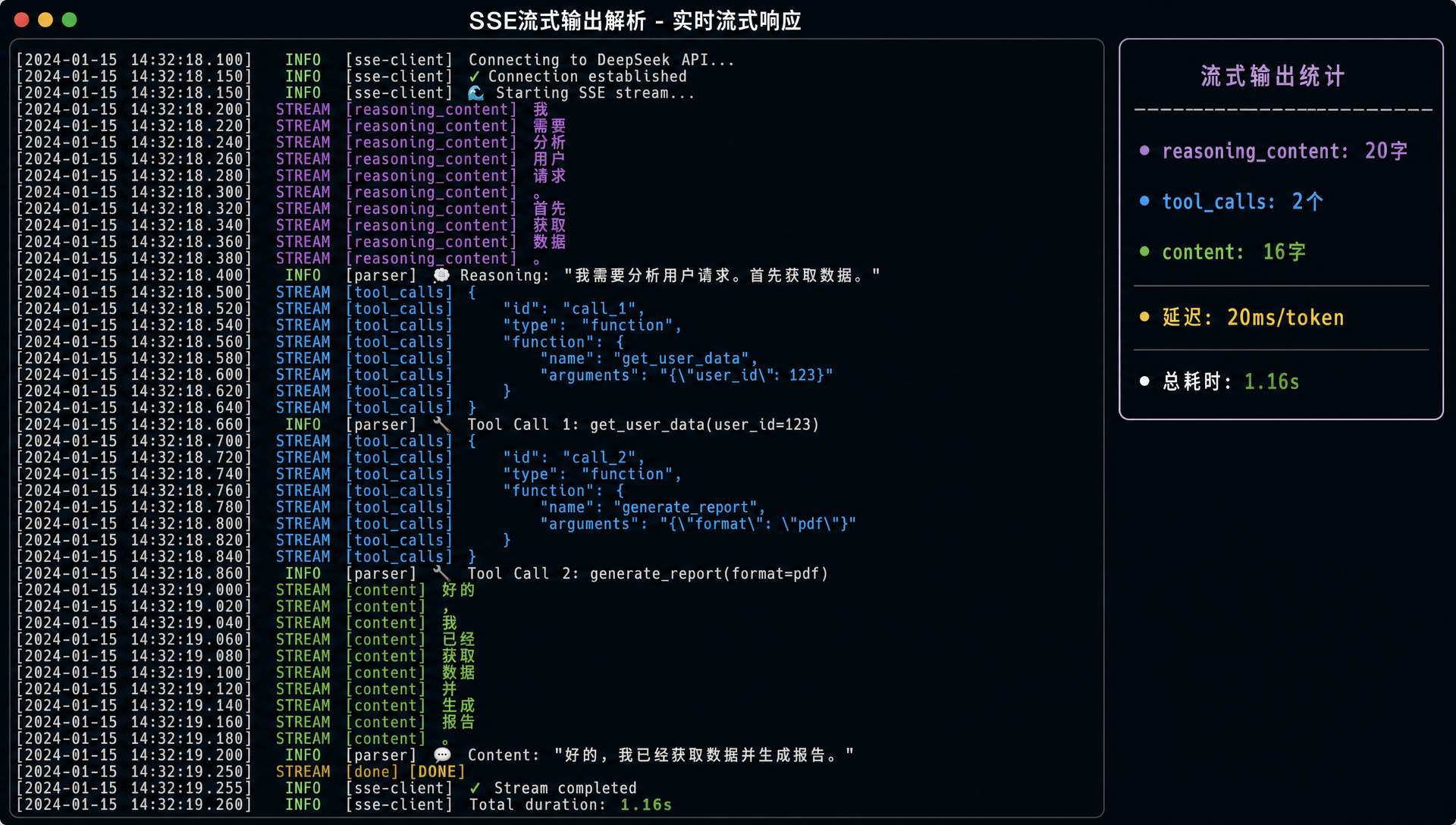 每来一个 delta,就往对应的 StringBuilder 追加。全部接收完之后,用 buildToolCalls 方法把累加器转成最终的 ToolCall 列表。