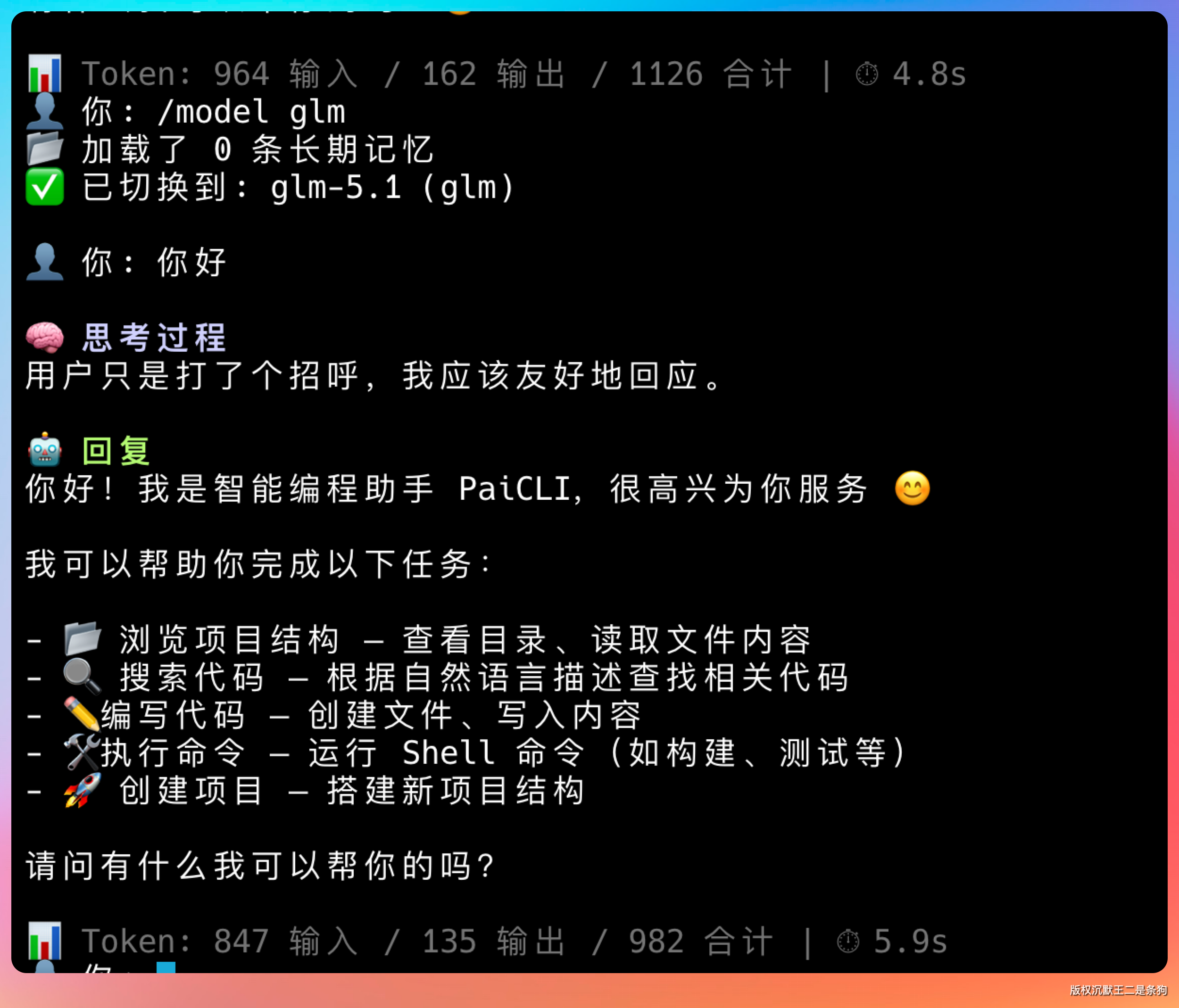 - GLM-5.1: 2719 输入 / 511 输出 / 3230 合计 | ⏱ 22.4s