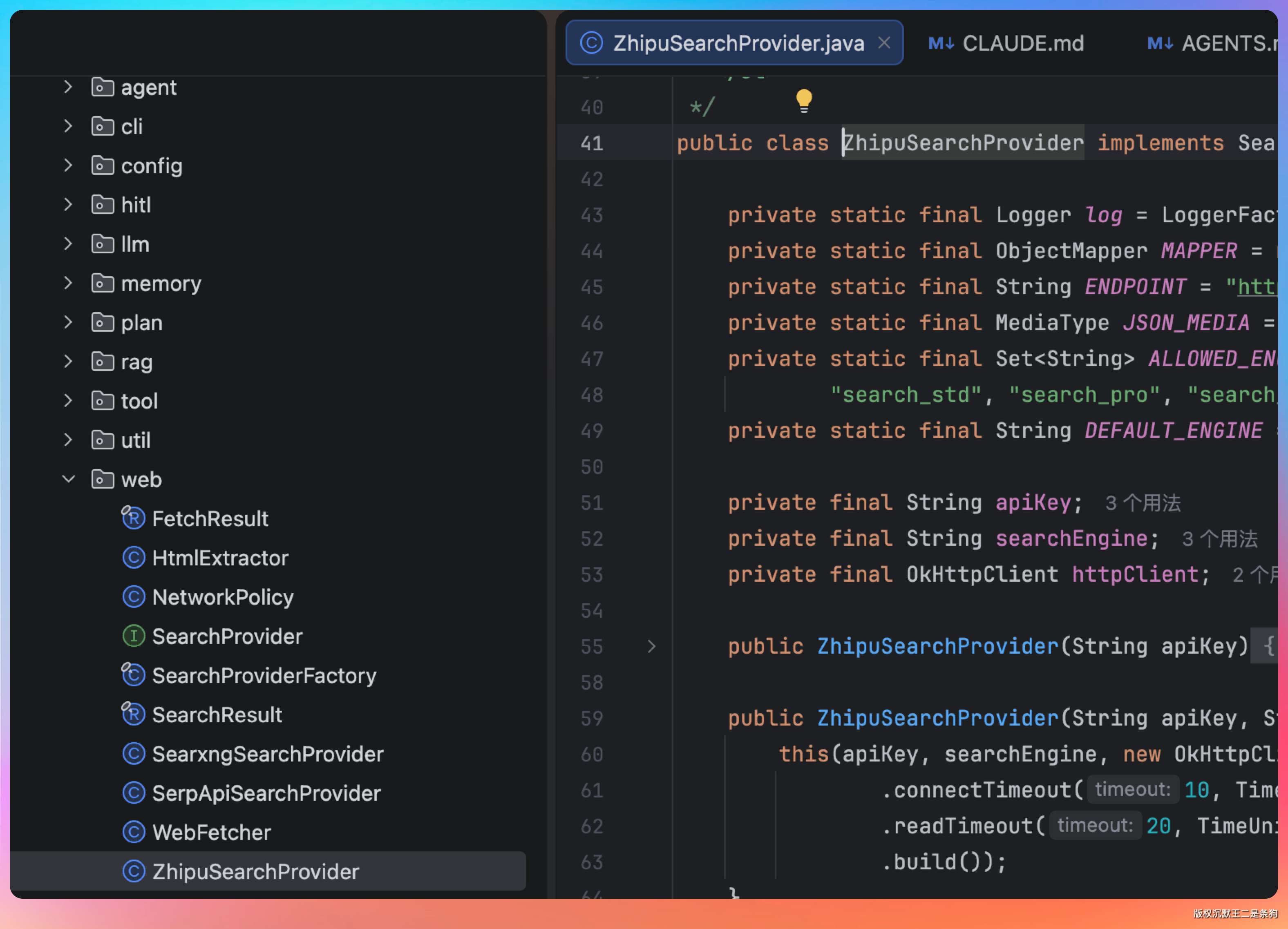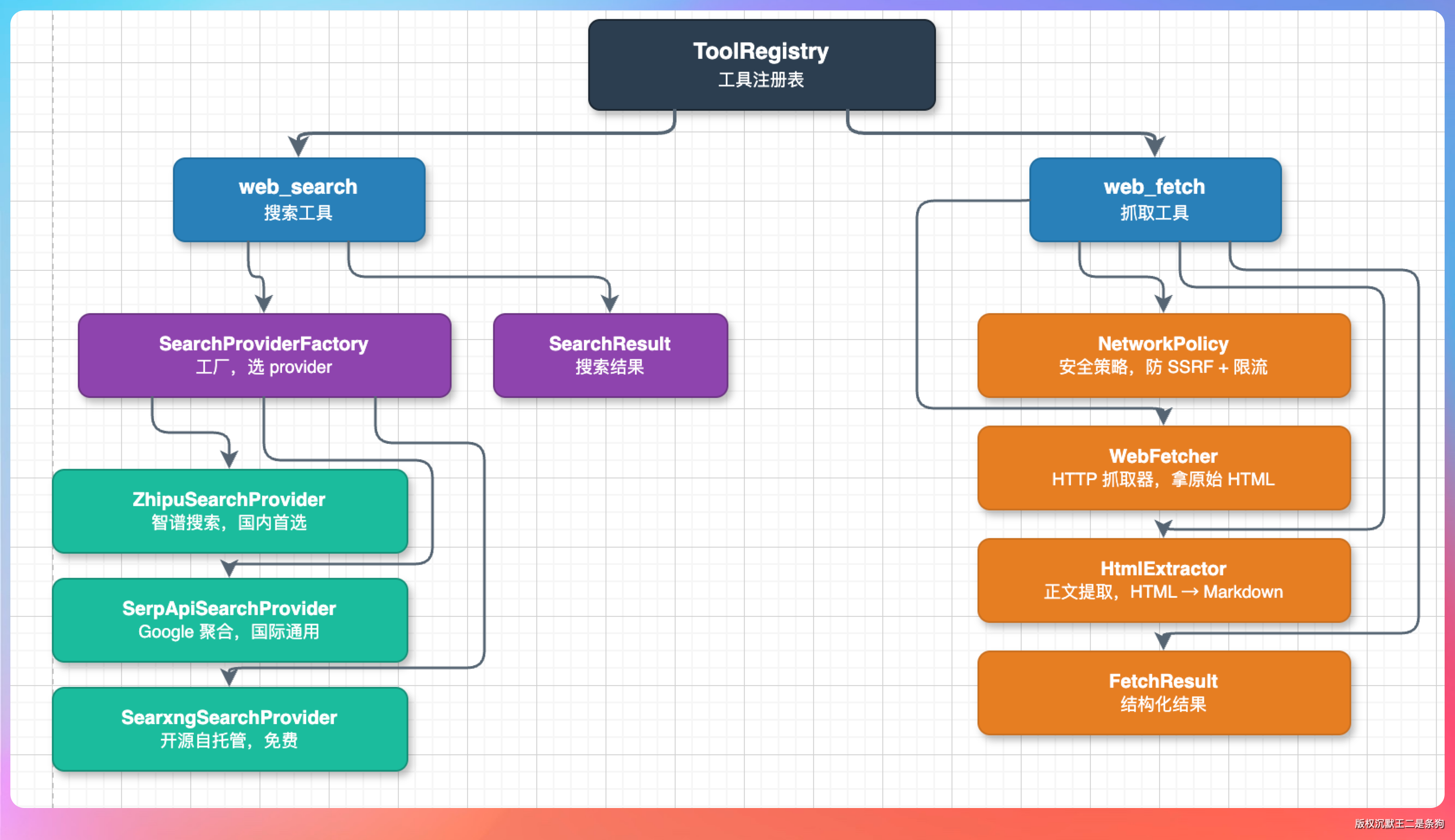 做了 Provider 抽象之后,以后哪怕再加一个 Bing Search 或者 Tavily,也只需要加一个实现类和工厂里加一行判断就行了,不用动任何现有逻辑。