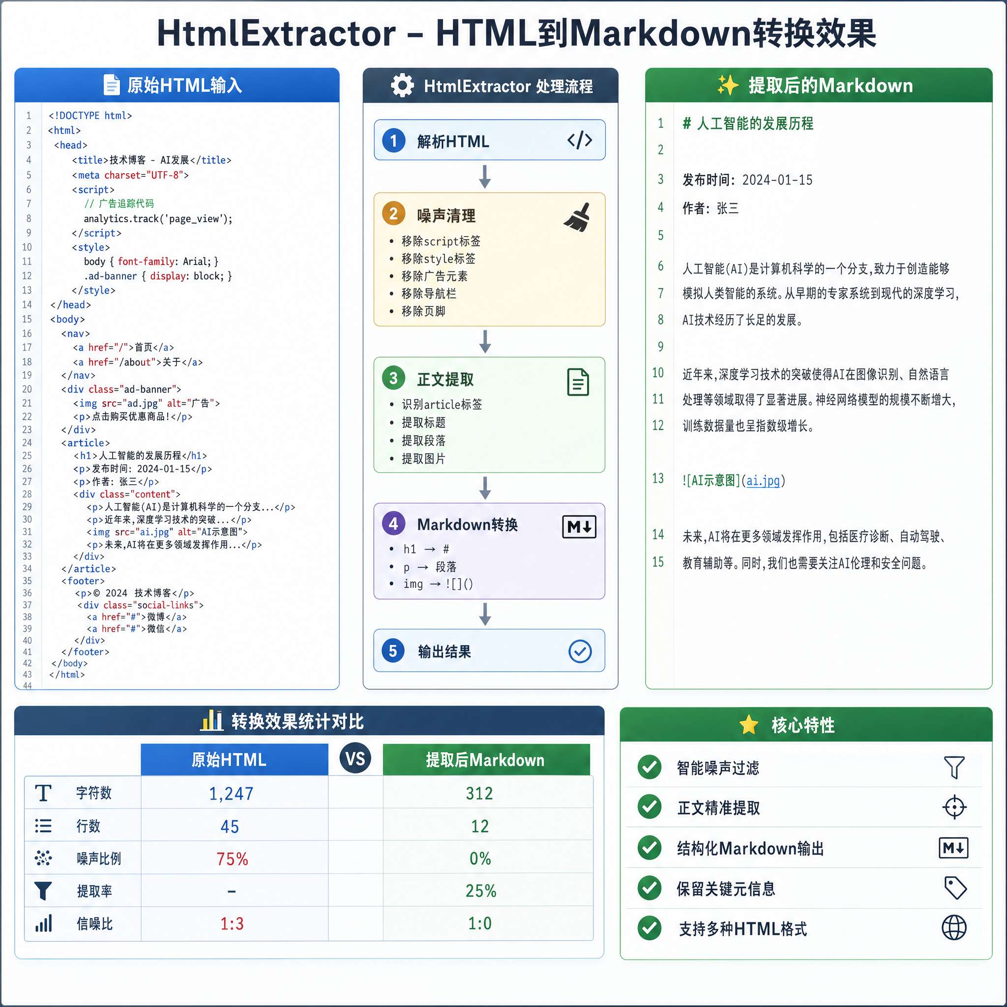 HTML 里充斥着导航栏、广告、评论区、页脚这些噪声。直接把整个 HTML 丢给 LLM 既浪费 token 又影响理解。HtmlExtractor 的工作就是把噪声去掉,只留正文,再转成 Markdown。