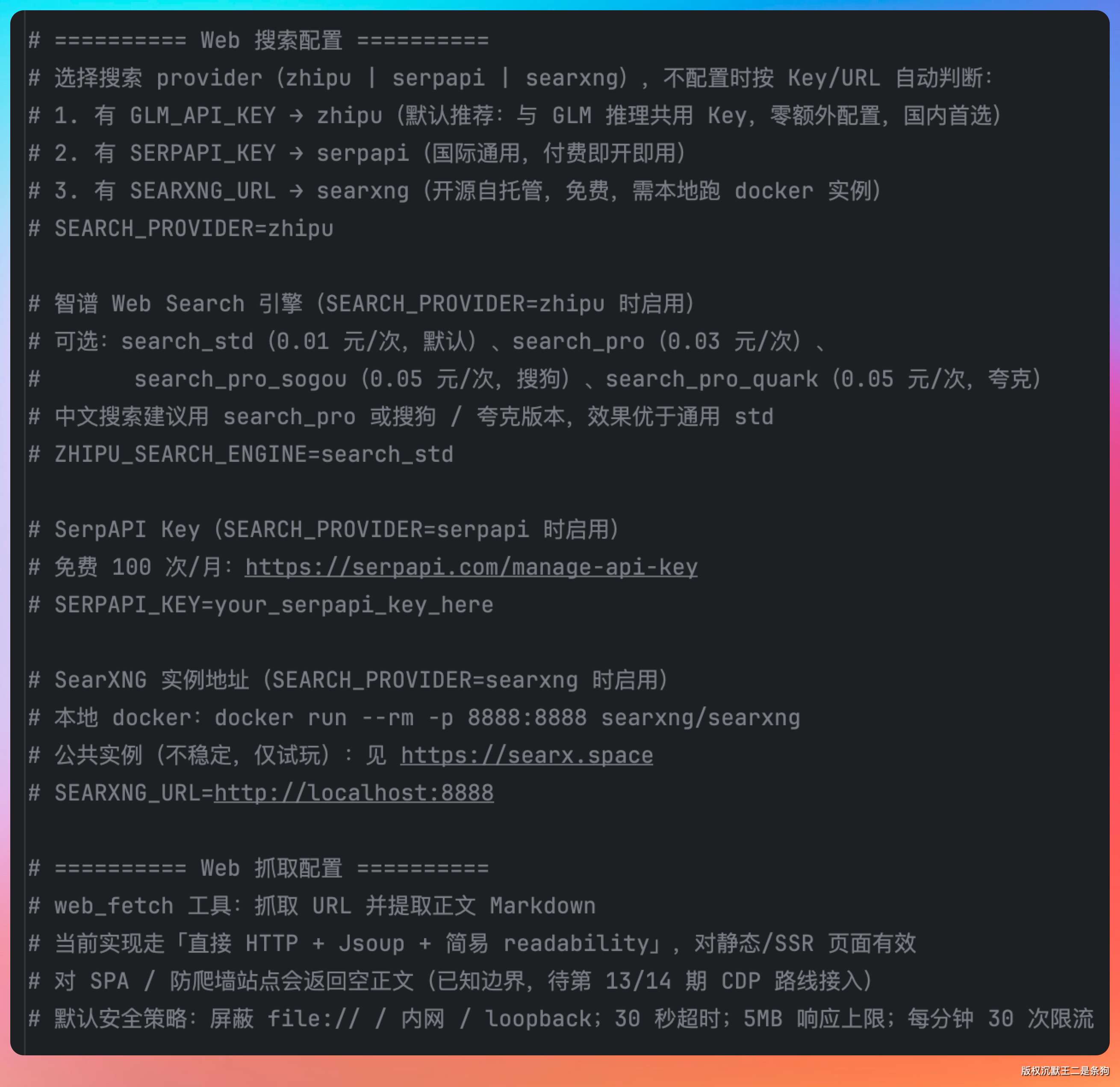 - 基于工厂模式实现了 SearchProviderFactory,支持从环境变量、系统属性、.env 文件三级回退读取配置,实现零额外配置的开箱即用体验