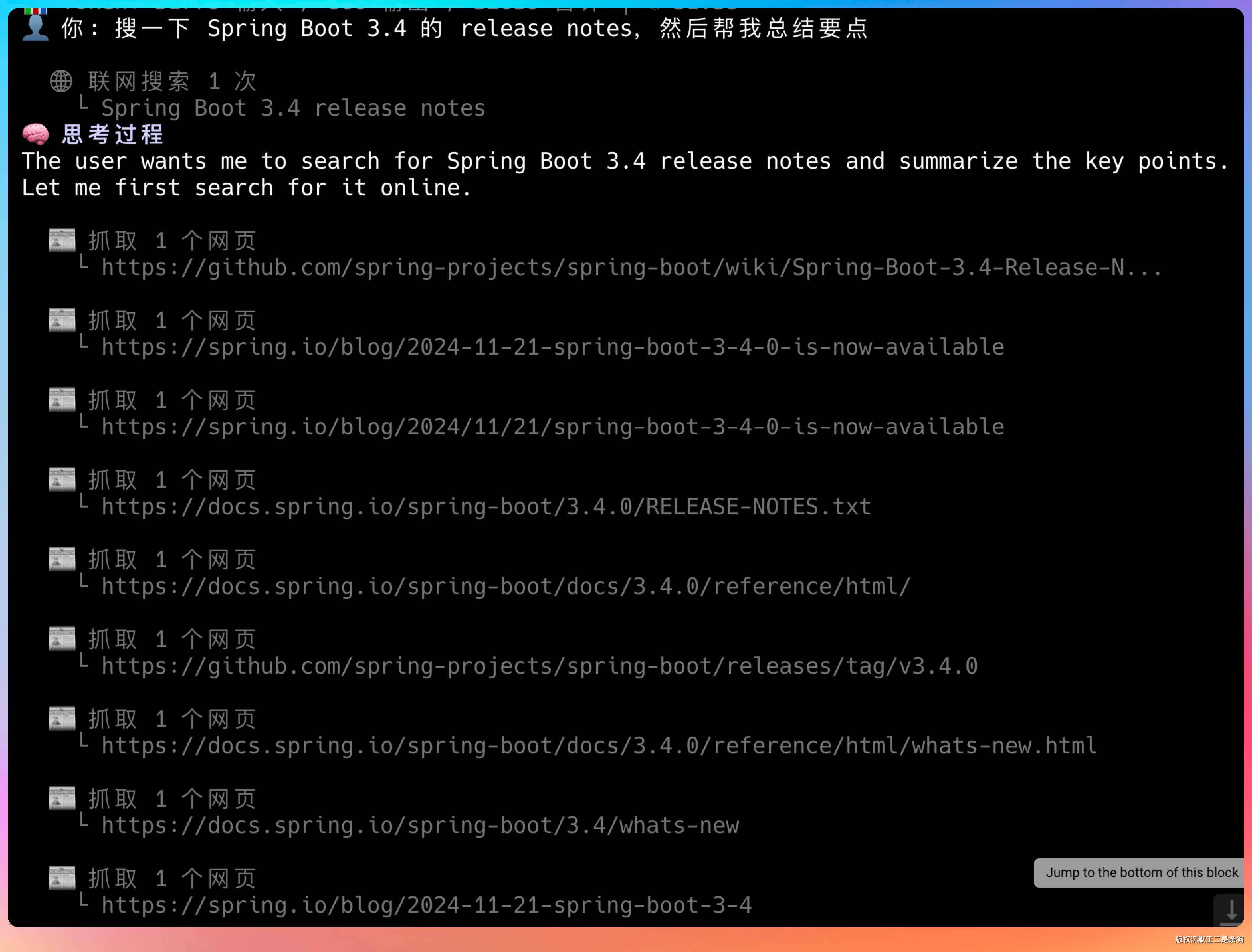 问“搜一下 Spring Boot 3.4 的 release notes,然后帮我总结要点”,Agent 会先搜再抓,组合使用两个工具。
