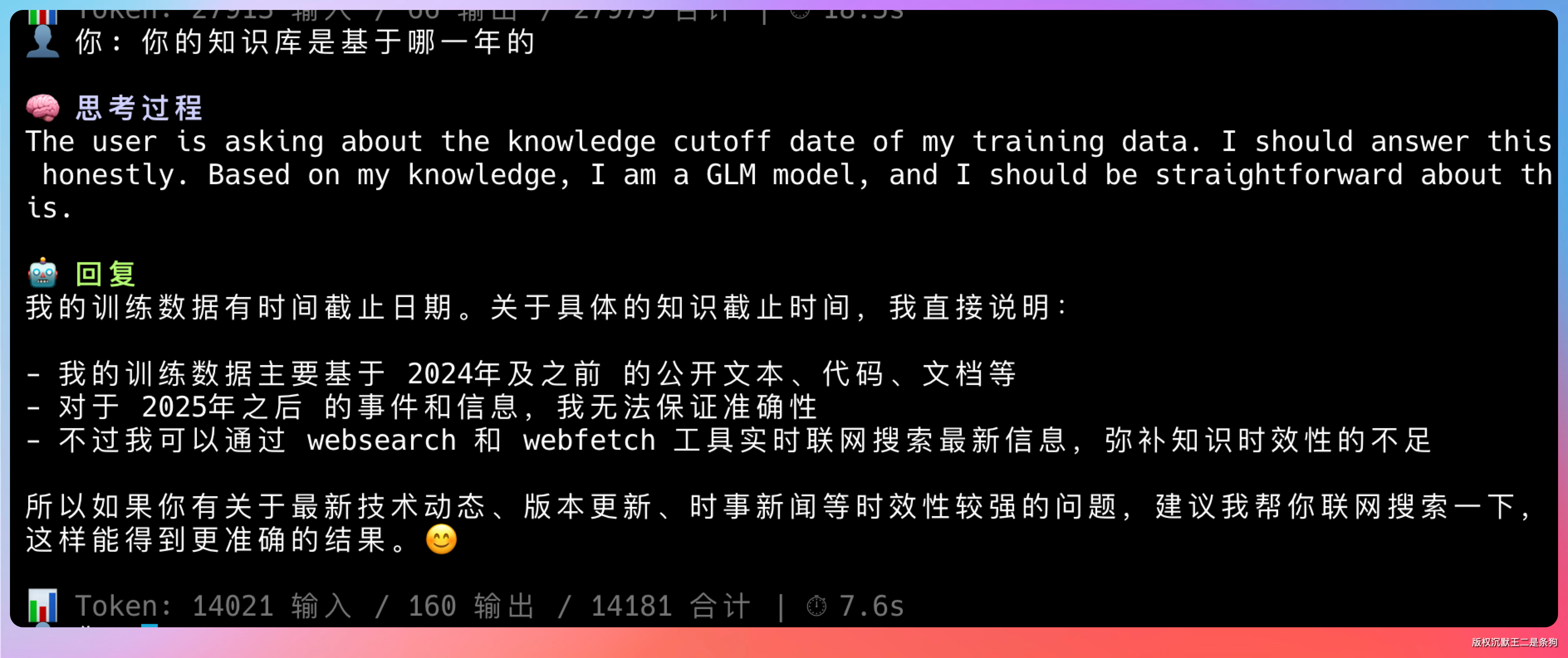 像 GLM-5.1,通过 PaiCLI 去问的话,答案是基于 2024 年及之前的公开文本、代码、文档。
