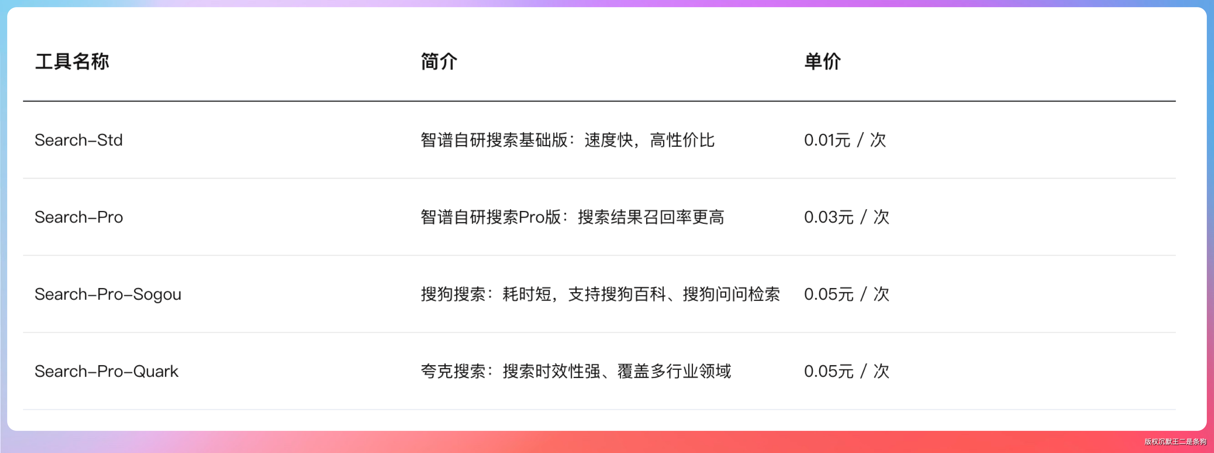 search_std标准版 0.01 元/次,search_pro增强版 0.03 元/次,- 还有搜狗和夸克的 Pro 版各 0.05 元/次。