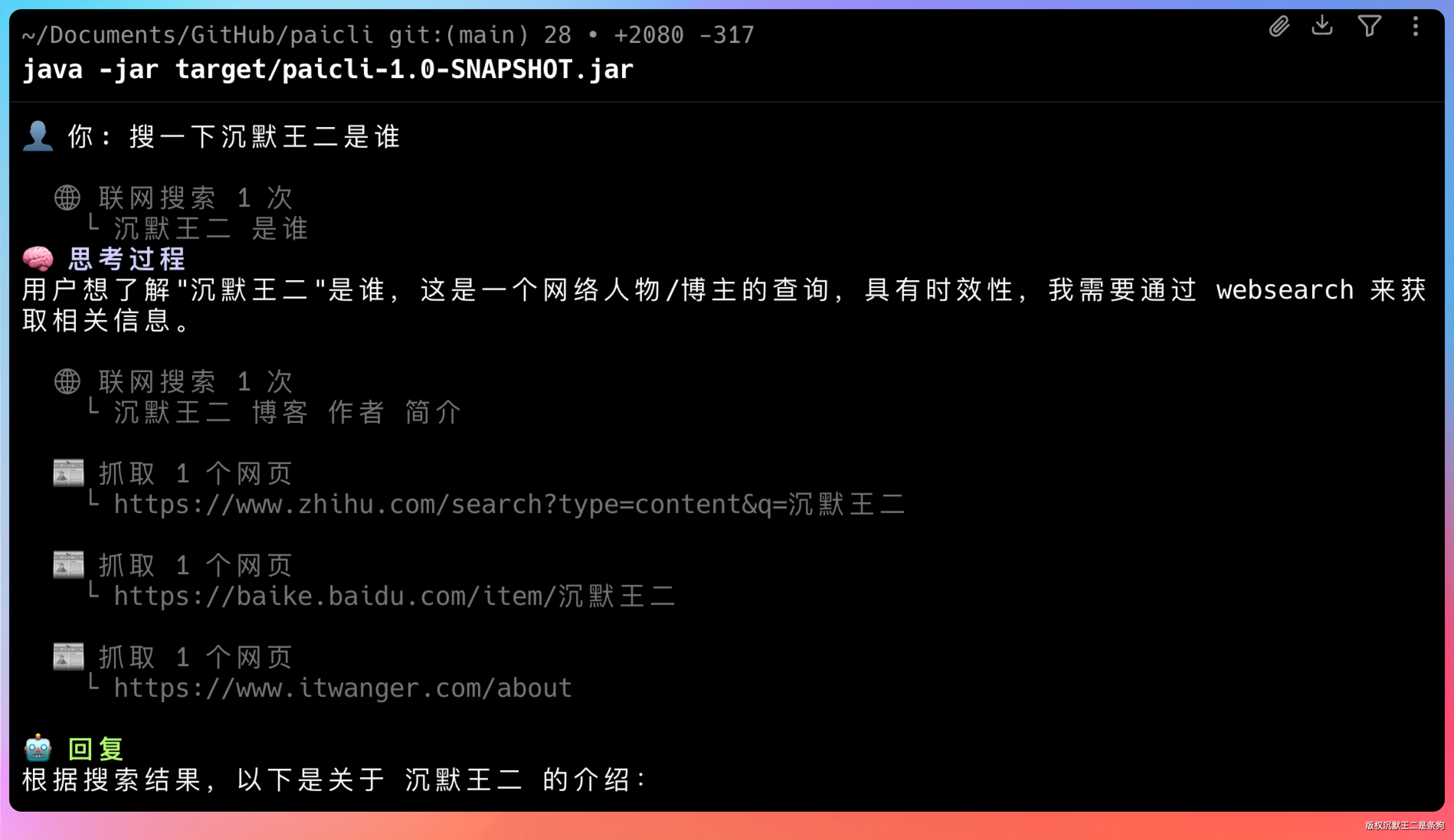 先来看 PaiCLI Agent 加上联网能力之后能干什么。