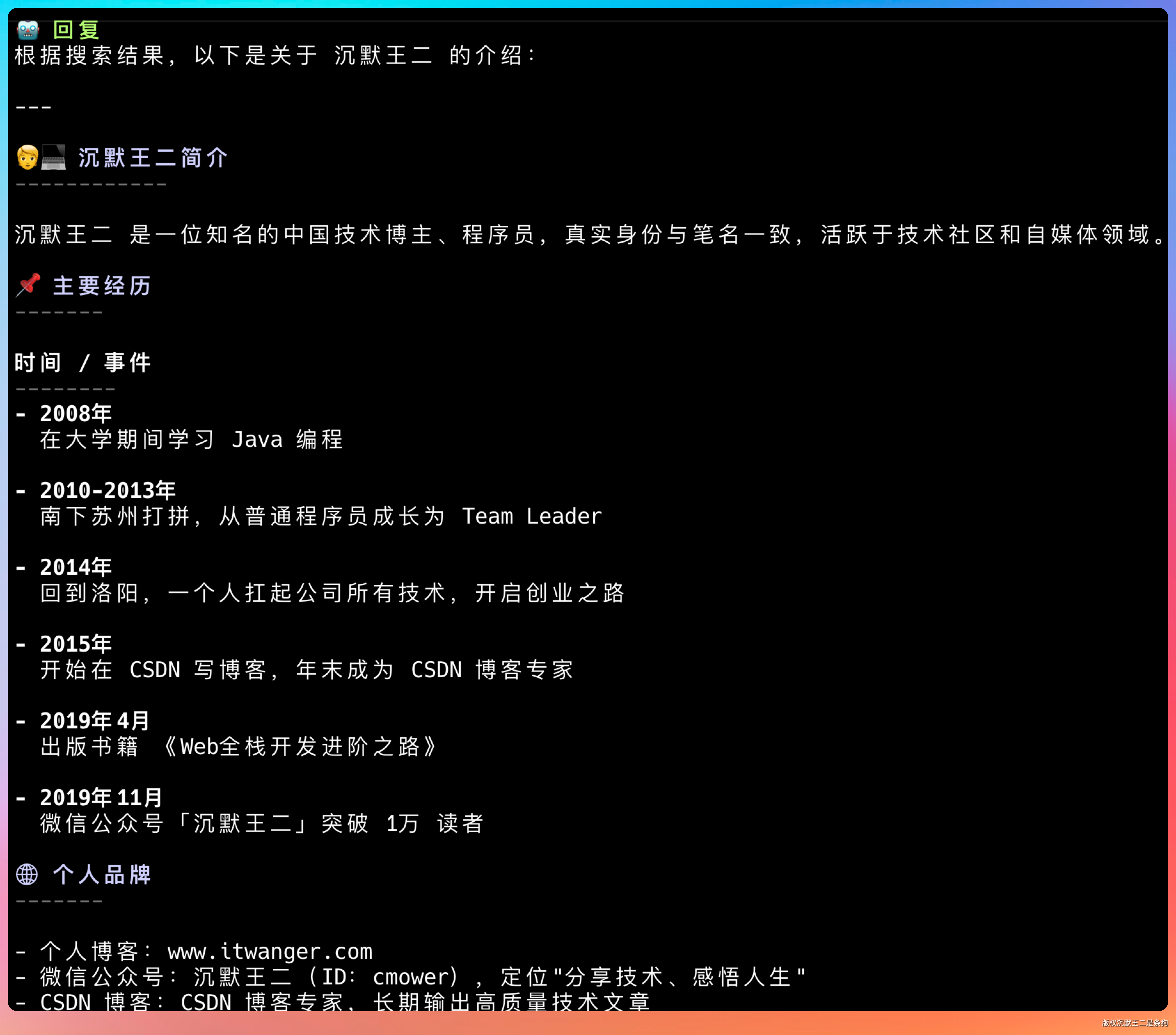 在终端里输入提示词:“搜一下沉默王二是谁”。