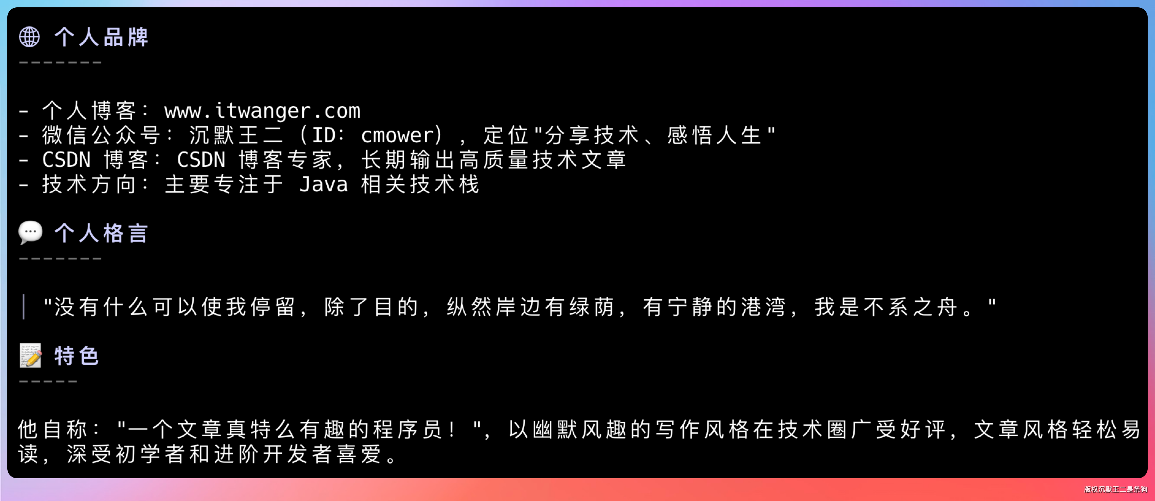 沉默王二 是一位知名的技术博主、程序员,真实身份与笔名一致,活跃于技术社区和自媒体领域。