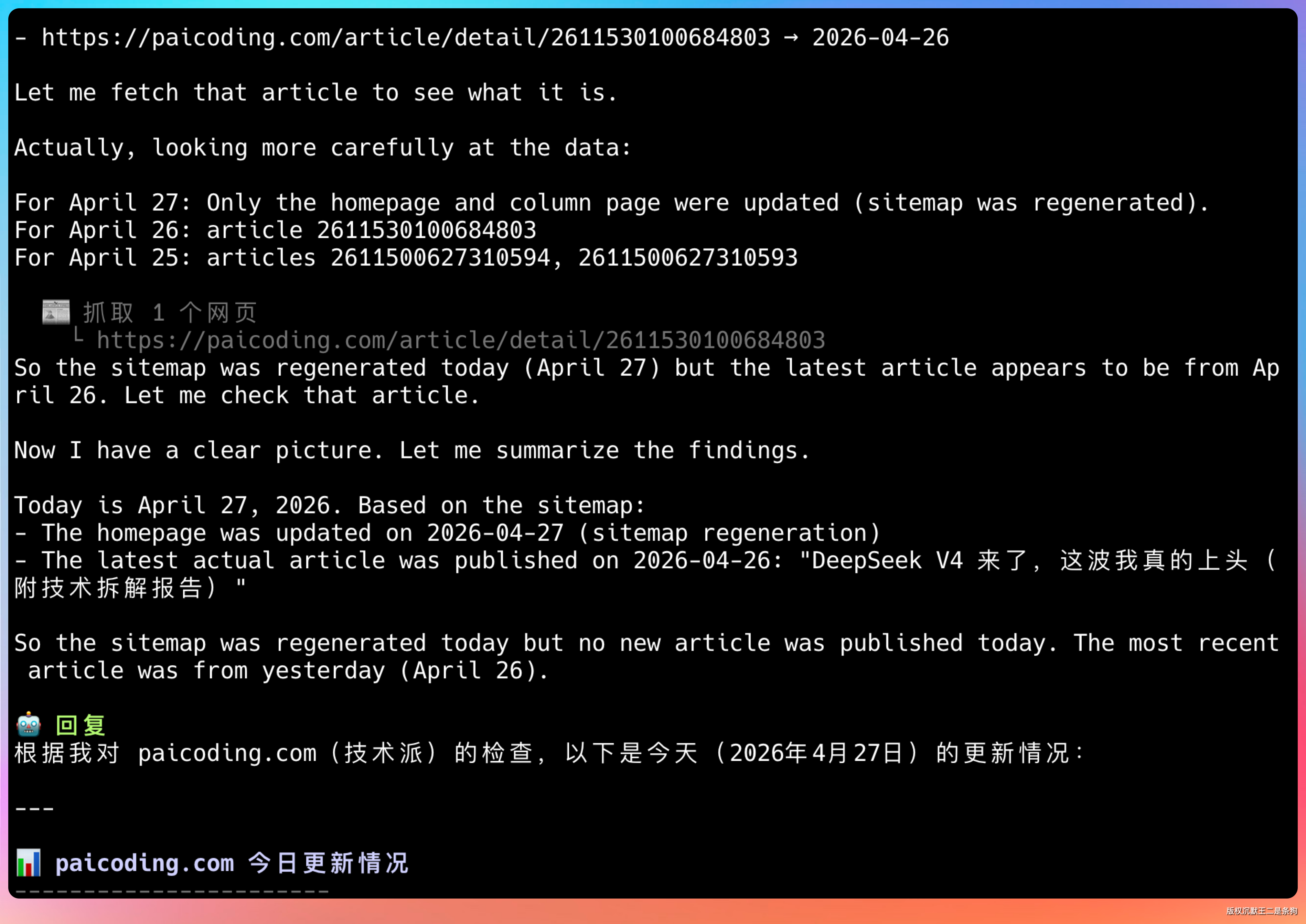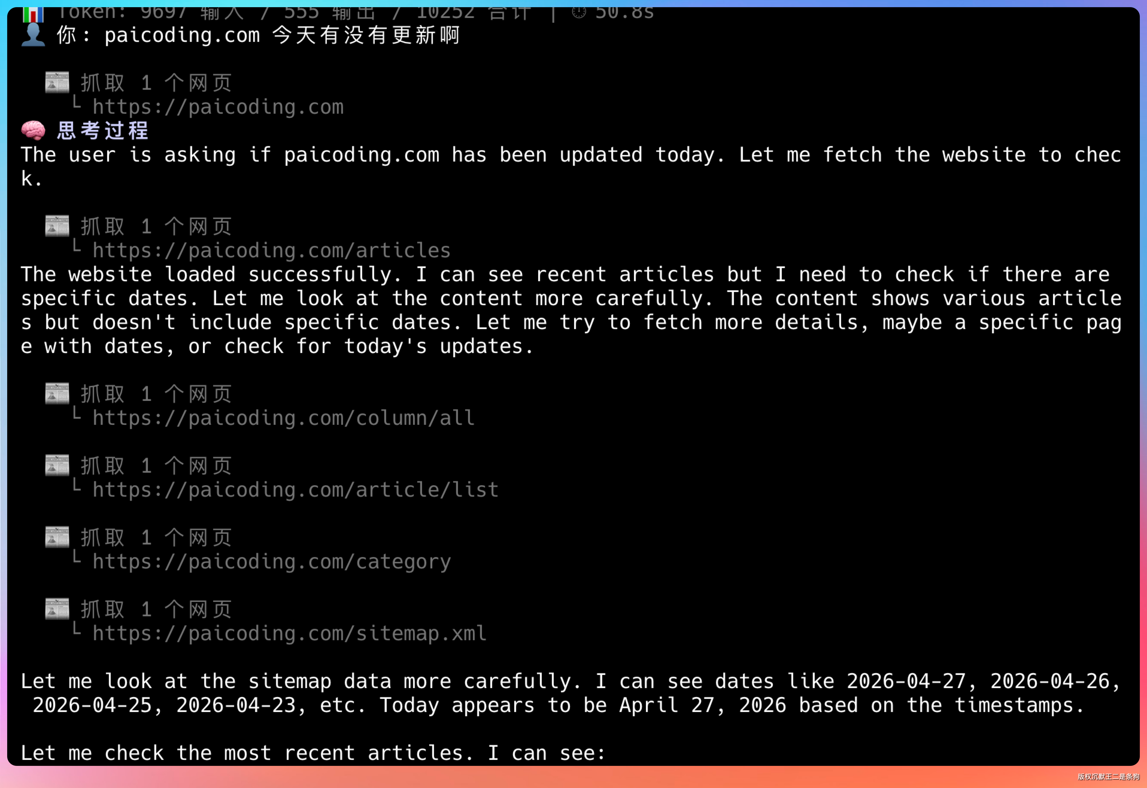 再来一个。输入提示词:“paicoding.com 今天有没有更新啊”。