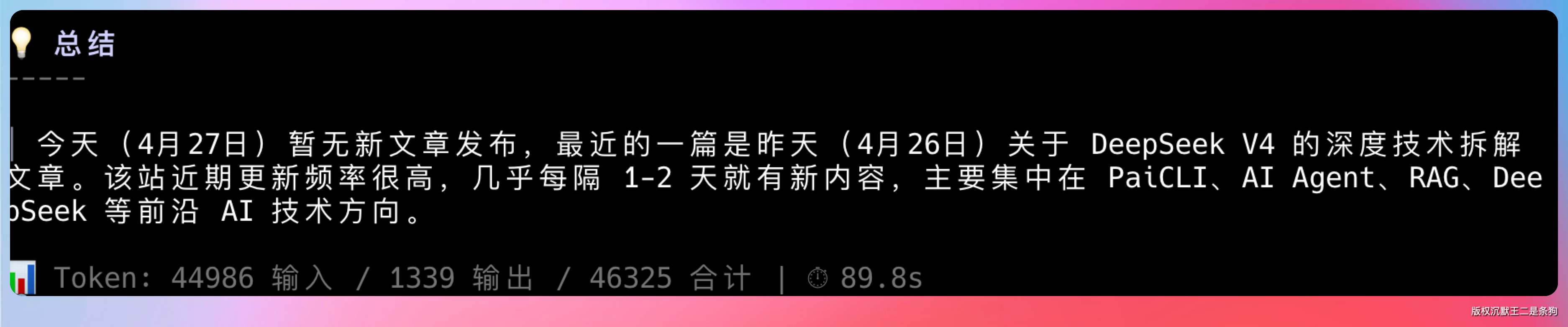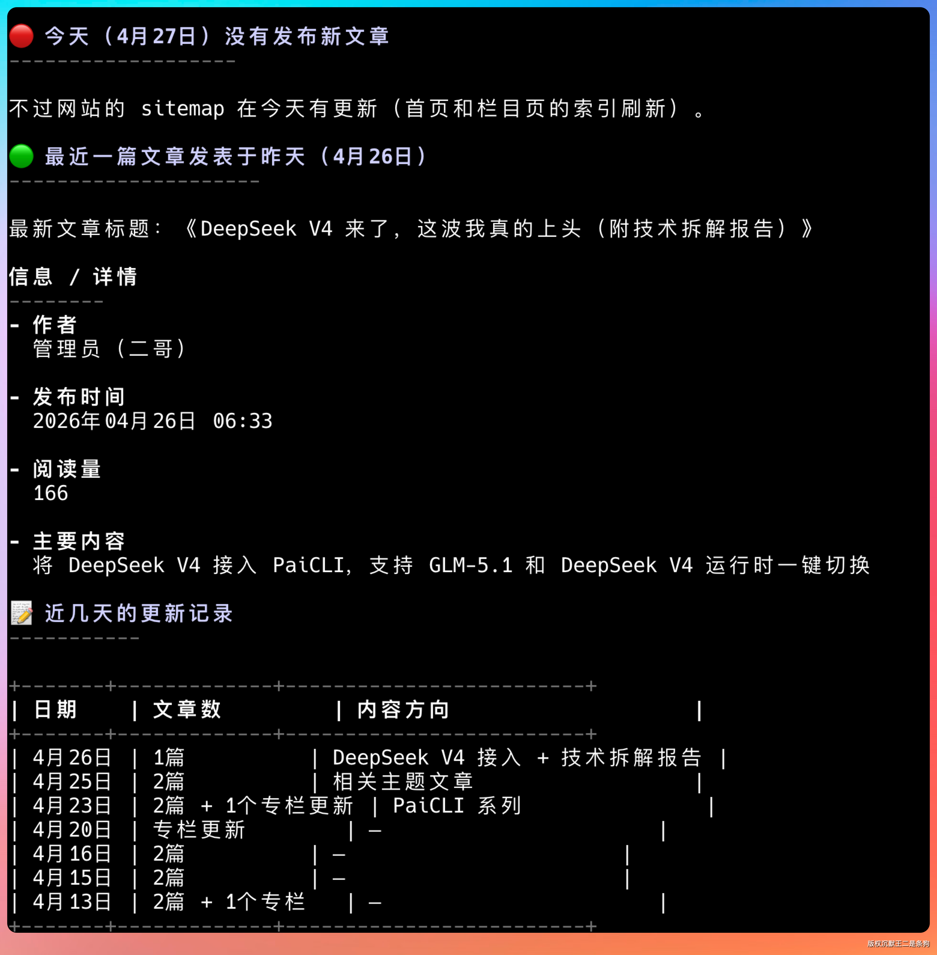 今天(4 月 27 日)暂无新文章发布,最近的一篇是昨天(4 月 26 日)关于 DeepSeek V4 的深度技术拆解文章。该站近期更新频率很高,几乎每隔 1-2 天就有新内容,主要集中在 PaiCLI、AI Agent、RAG、DeepSeek 等前沿 AI 技术方向。