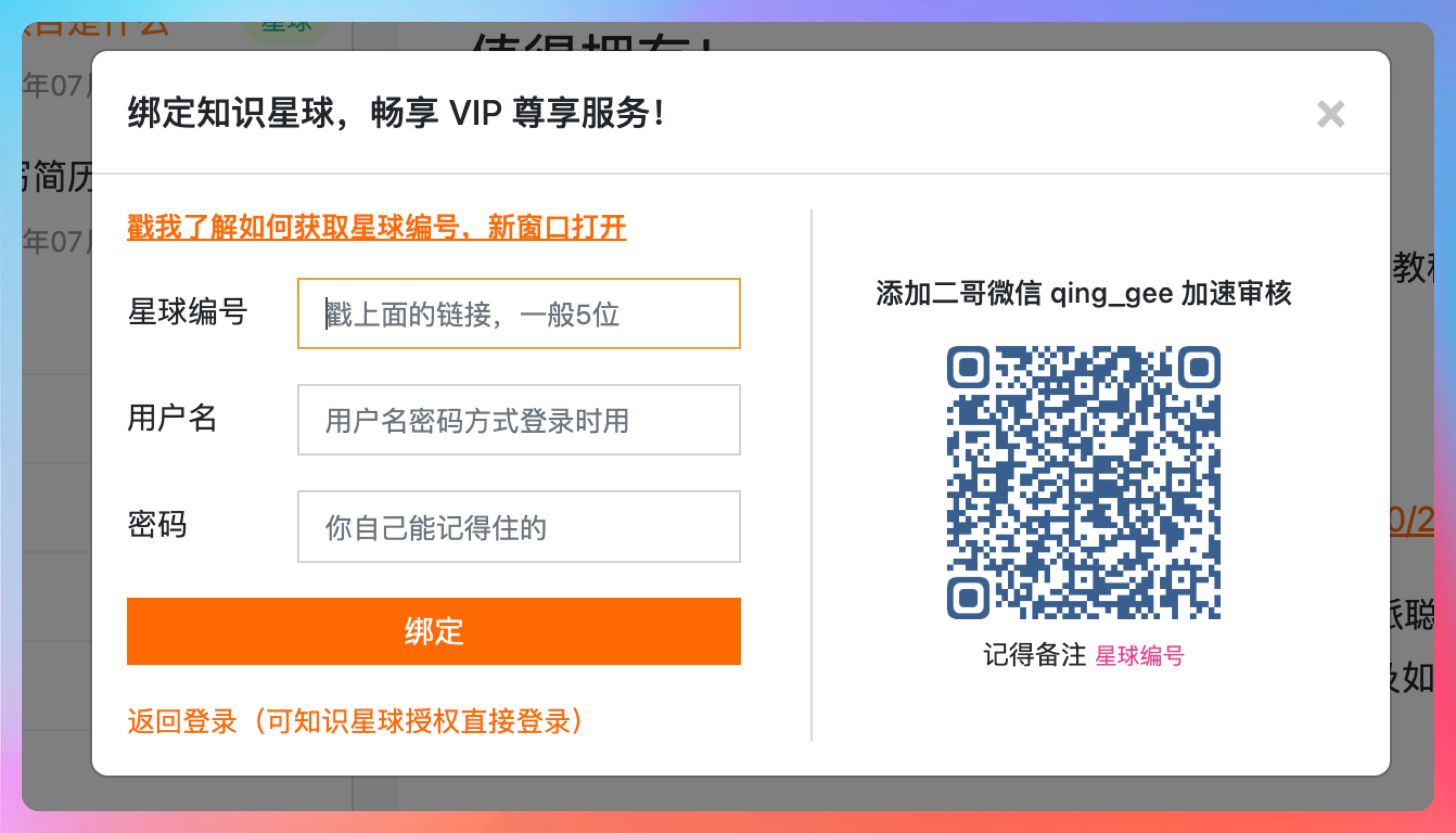 填写星球编号、用户名、密码后【绑定】。这样你就获得了用户名密码登录+微信扫码登录两种登录方式。