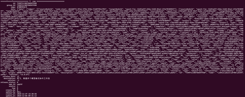 PaiFlow 的 DSL 存储在 workflow.flow 表中,直接就是 JSON 格式的字符串。比如下面这个“多模型协作工作流”,在数据库里是这样的记录。