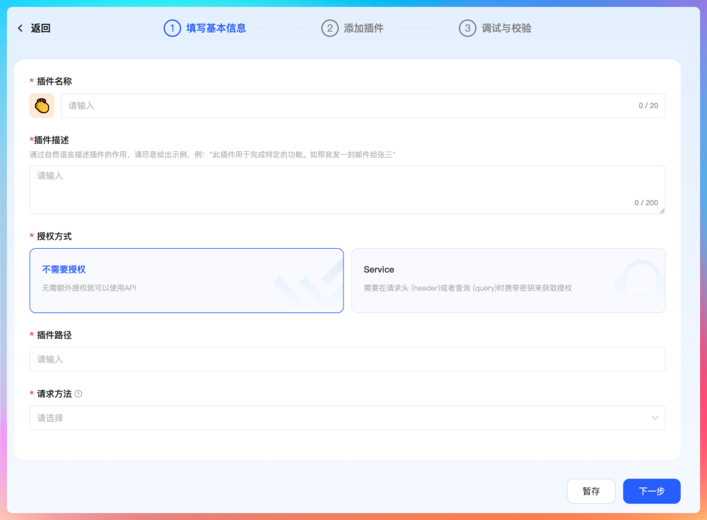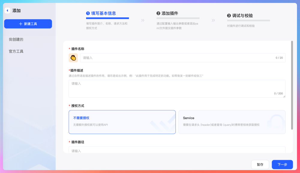 然后进入【新建工具】页,通过填写基本信息、插件信息、验证信息新建一个工具,这种适合你在编排工作流的时候,临时起意想调用一个工具。