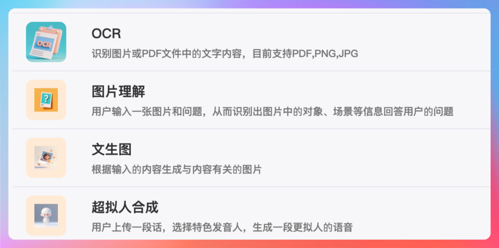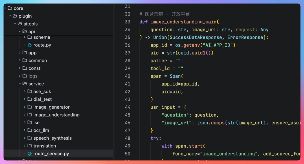 它们在 Python 版的 aitools 中一一对应这些,ocr_llm 是 OCR 工具的实现,image_understanding 是图片理解工具的实现,image_generator 是图片生成工具的实现,speech_synthesis 是超拟人合成工具的实现。