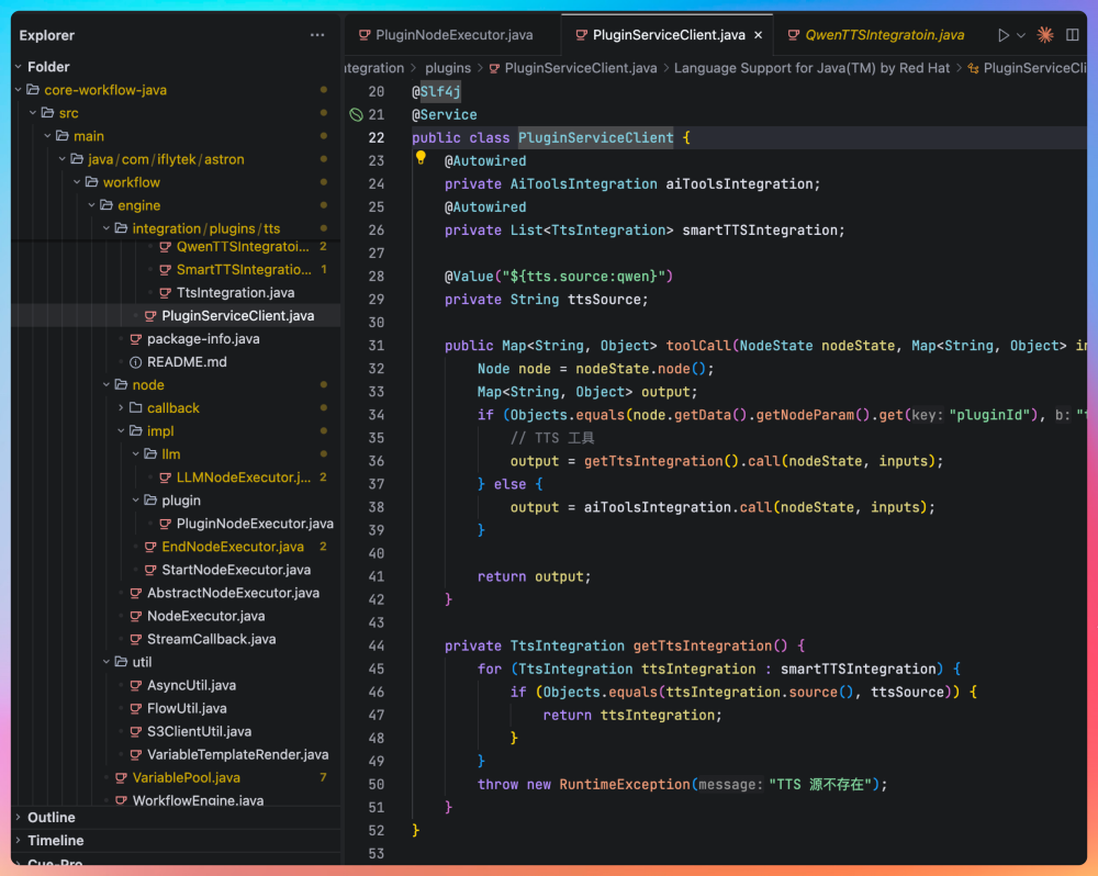 Java 版的工作流我们暂时只实现了超拟人合成节点的内置(第二期我们可以陆续实现图片生成/图片理解/OCR 等内置插件),放在了 plugins/tts 目录下,支持阿里通义千问的 tts(Text-to-Speech)和讯飞的 tts。
