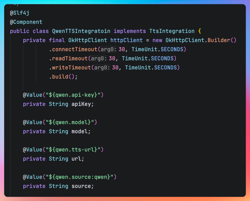 接下来,我们在 toolCall 方法执行的过程中调用 getTtsIntegration 方法判断 ttsSource 的值,如果是 qwen 就会执行 QwenTTSIntegratoin 的 call 方法。