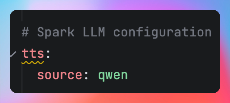 source 的配置在 application.yml 文件中,可选项目前有 spark 和 qwen,通过这个配置就能切换到 SmartTTSIntegration 或者 QwenTTSIntegration 来完成超拟人音频内置插件的执行。