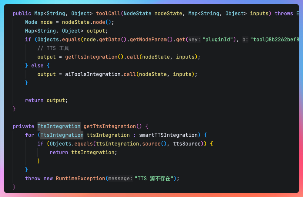 TtsIntegration 接口定义的比较简单,source 方法返回插件的标识符,call 方法规定了所有 TTS 实现都必须接收 NodeState 和 inputs 作为参数,并返回一个包含结果的 Map。确保无论底层调用哪个厂商的服务,对于上层调用者 PluginServiceClient 来说,调用方式都是一致的。