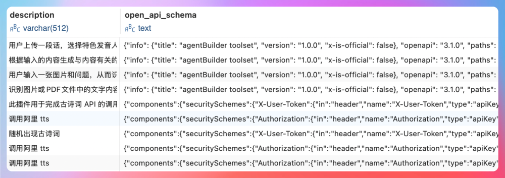 在 PaiFlow 中,插件 Schema 一共存了两份。一份是给控制台 hub 用的,放在 paiflow-console.tool_box 表中。除了 schema 本体,往往还会带一些展示和运营属性,比如工具名称怎么展示、分类、备注、是否启用、是谁录入的、更新时间之类的。