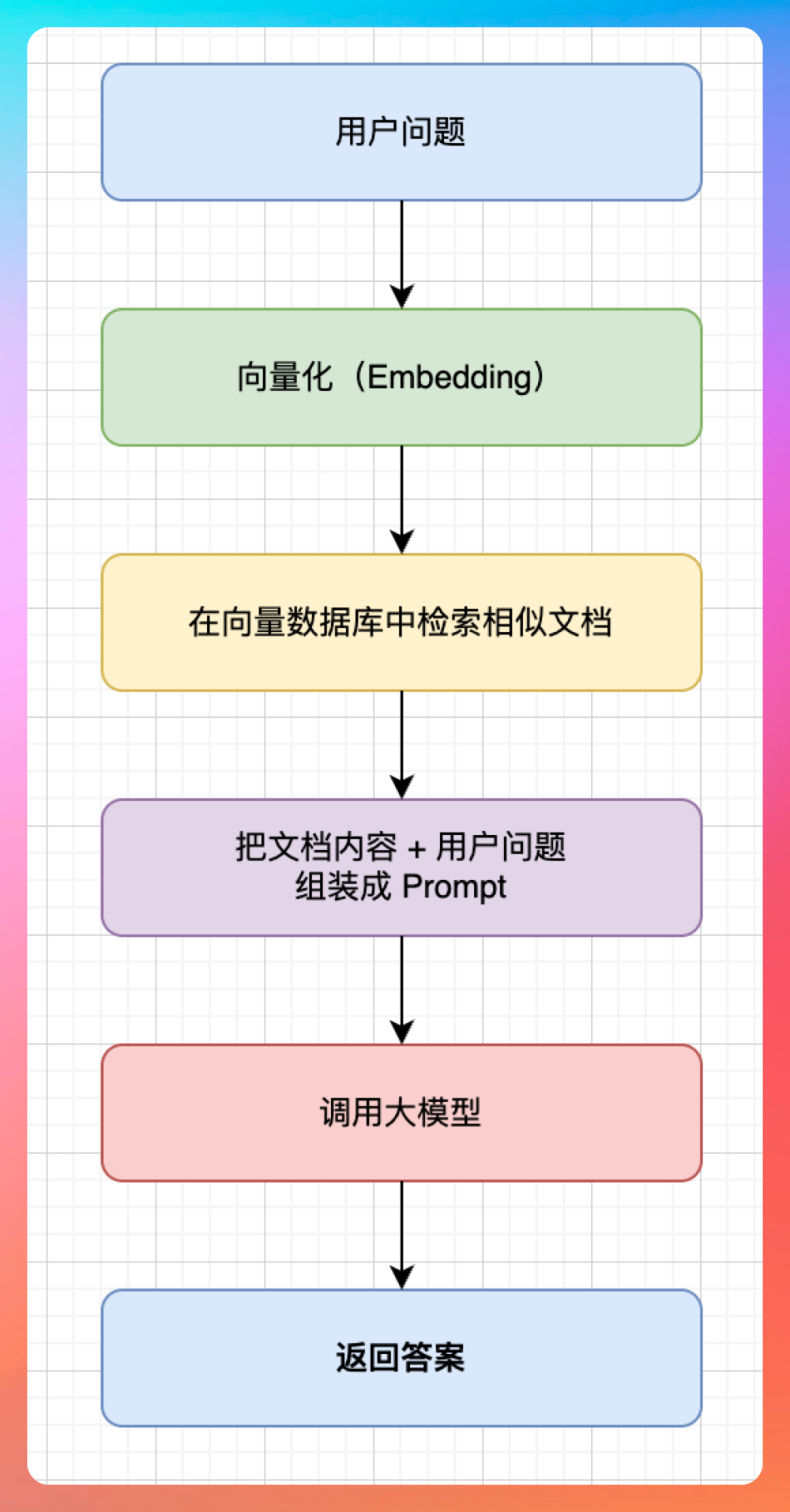 用户问一个问题 → 系统先把问题转成向量(Embedding)→ 去知识库里检索最相关的文档片段 → 把这些片段塞进 prompt 里 → LLM 基于这些"参考资料"生成回答