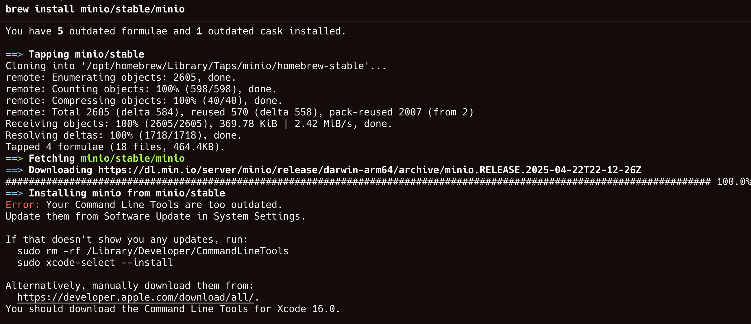 我本机提示命令行工具过时了,所以安装失败了。但我又不想升级系统,所以咱们需要换一个方法。