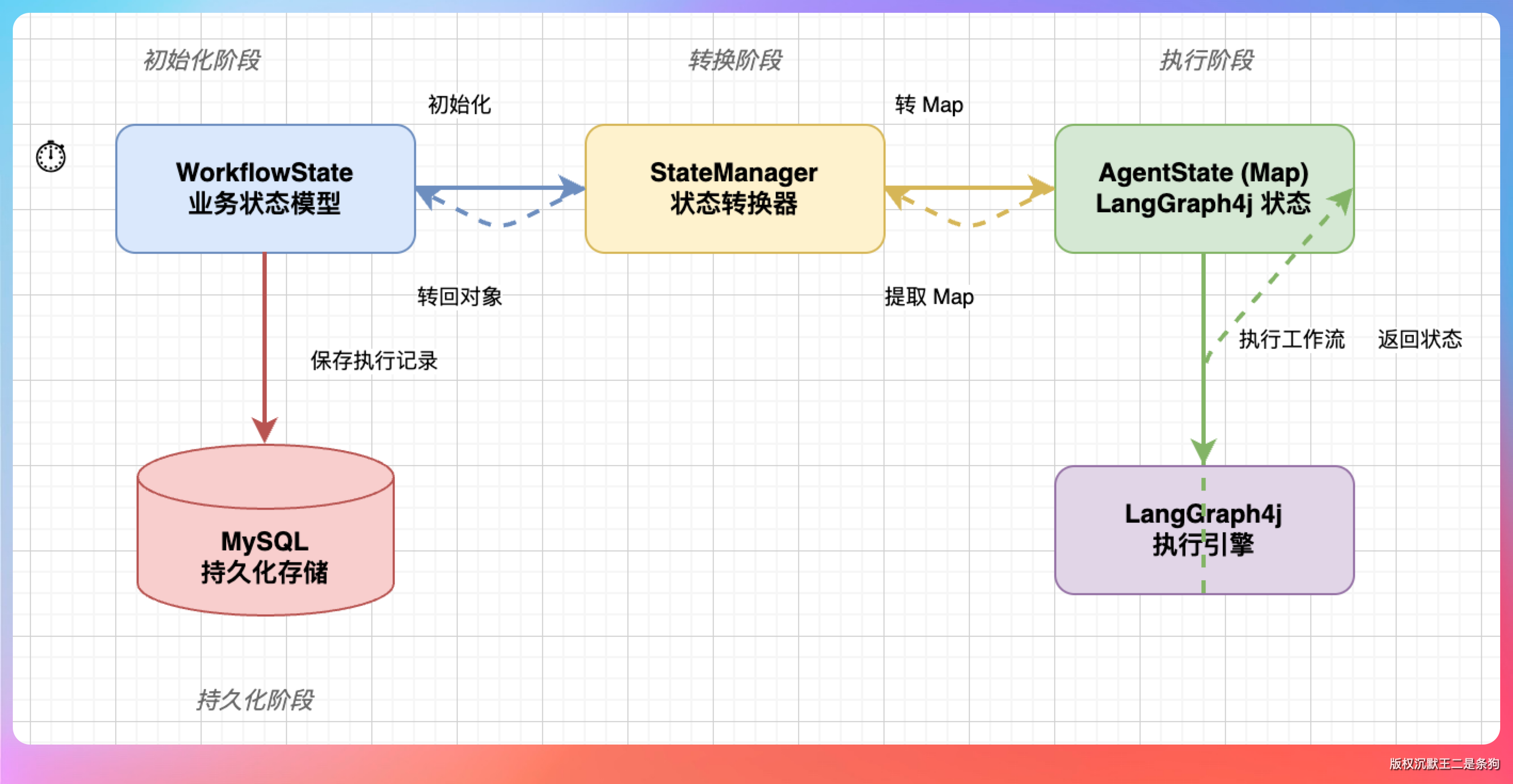 我说:“WorkflowState 是我们自己定义的业务模型,方便序列化和持久化。AgentState 是 LangGraph4j 框架的状态模型。StateManager 负责两者之间的转换,初始化时 WorkflowState 转 Map 给 LangGraph4j,执行完再从 Map 提取回 WorkflowState 用来保存执行记录。”