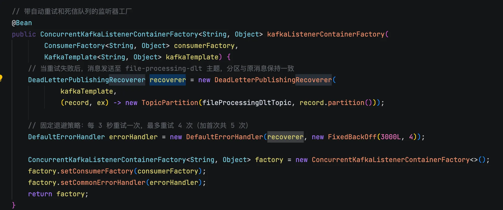 派聪明通过 DefaultErrorHandler 实现了一套优雅的消费者重试与死信队列机制。FixedBackOff 会阻塞当前消费线程 ,等待 1 秒后进行第一次重试。如果再次失败,它会再等 1 秒,进行第二次重试,总共最多重试 4 次。如果 4 次后仍然失败, DeadLetterPublishingRecoverer 会接管这个消息,将它发送到死信队列中 (在项目中是 file-processing-dlt )。